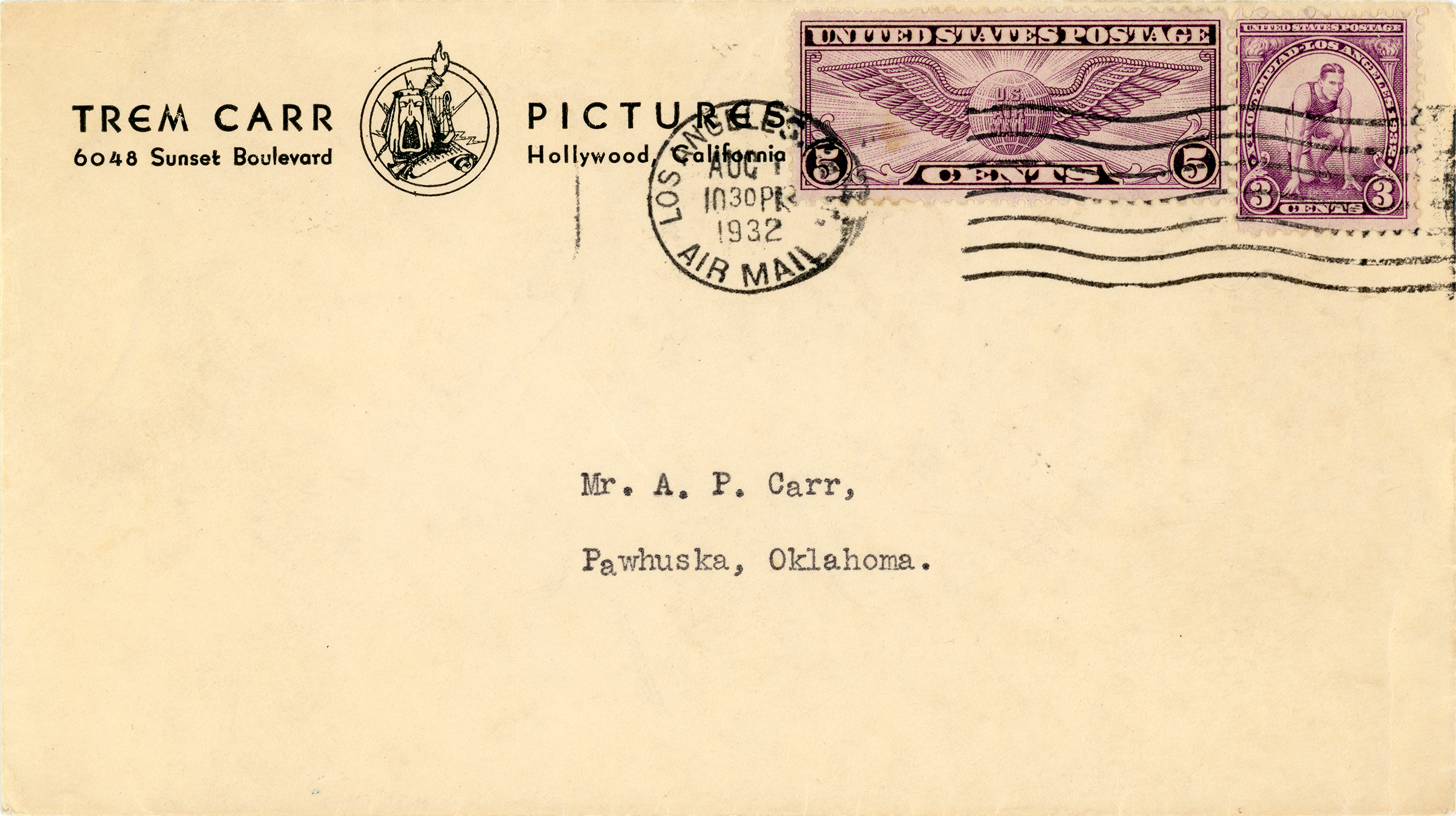 Embossed No. 6 envelope (3⅝ x 6½ inches) from Trem Carr Pictures of Gower Gulch (Sunset and Gower in Hollywood), addressed to Trem Carr's older brother, oilman Arnold Plack "A.P." Carr, of Pawhuska, Oklahoma, sent by airmail in August 1932. "Plack" was A.P.'s mother's maiden name. Arnold (b.1886) and Trem (b.1891) were two of three children of William Toney Carr, a druggist, and Amy Bertha Plack Carr of Trenton, Illinois. A sister, Tonina, came between them in 1888. At the time our envelope was mailed, Trem Carr was producing and distributing movies, some starring a young John Wayne, that were made at the Placerita Canyon movie ranch Carr leased in 1931. Today the property is part of Walt Disney Co.'s Golden Oak Ranch on the east side of the 14 Freeway at Placerita Canyon Road. When Carr's lease expired in 1936, he moved his operation to Ernie Hickson's Placeritos Ranch, aka Monogram Ranch, which eventually became Melody Ranch. The correspondence is missing from the envelope, but we can take a pretty good gander at its subject matter. In 1932, A.P. Carr was trying to square accounts with a partner in a luckless oil venture in Zapata County, Texas. In April, at a cost of $7,840.30, they had two wells dug that proved to be dusters. With financing from brother Trem, A.P. was able to pay his half-share of the oil leases, but he still owed money for the drilling. In May 1932, A.P. Carr tried to convince the partner, Texas oilman W.J. McGinley, to let bygones be bygones. "We just lost, and that's all there is to it," A.P. Carr wrote to McGinley (see below). "I agree with my brother's letter of April 28th. Let's close this out and turn to something else. ... Together we [A.P. and Trem] will work out the cash to pay the bills, although it may not be at once, as Trem has had nearly $2,000.00 of extraordinary expense recently." No doubt related to Trem's budding "B" (low-budget) Western empire. In his 1932 letter to McGinley, A.P. Carr signaled his intent to relocate to California, as other Oklahomans were doing. A 1920s oil boom that drove Pawhuska's population past 6,000 had gone bust; worse, family farms were drying up and blowing away. But if A.P. came to the West Coast at all, it was only temporary. He ended up in Dallas. In 1935, McGinley sued A.P. Carr for his unpaid portion of the drilling cost and won. In 1937, A.P. challenged the verdict in the Court of Civil Appeals in Texarkana and lost. By that time, brother Trem had moved over to Universal where he continued to produce the occasional John Wayne movie made in the Santa Clarita Valley such as 1937's "California Straight Ahead!" In the film, Wayne plays a truck driver in a cross-country race against a train to see who can deliver aviation parts to California ahead of a labor strike. The picture was supposed to be shot in San Francisco, but the script had to be rewritten to fit Los Angeles when a Bay Area labor strike stymied production. Trem Carr worked in the motion picture business until his death in 1946. His 5-year-older brother outlived him by 36 years. "Sis" outlived them all.
