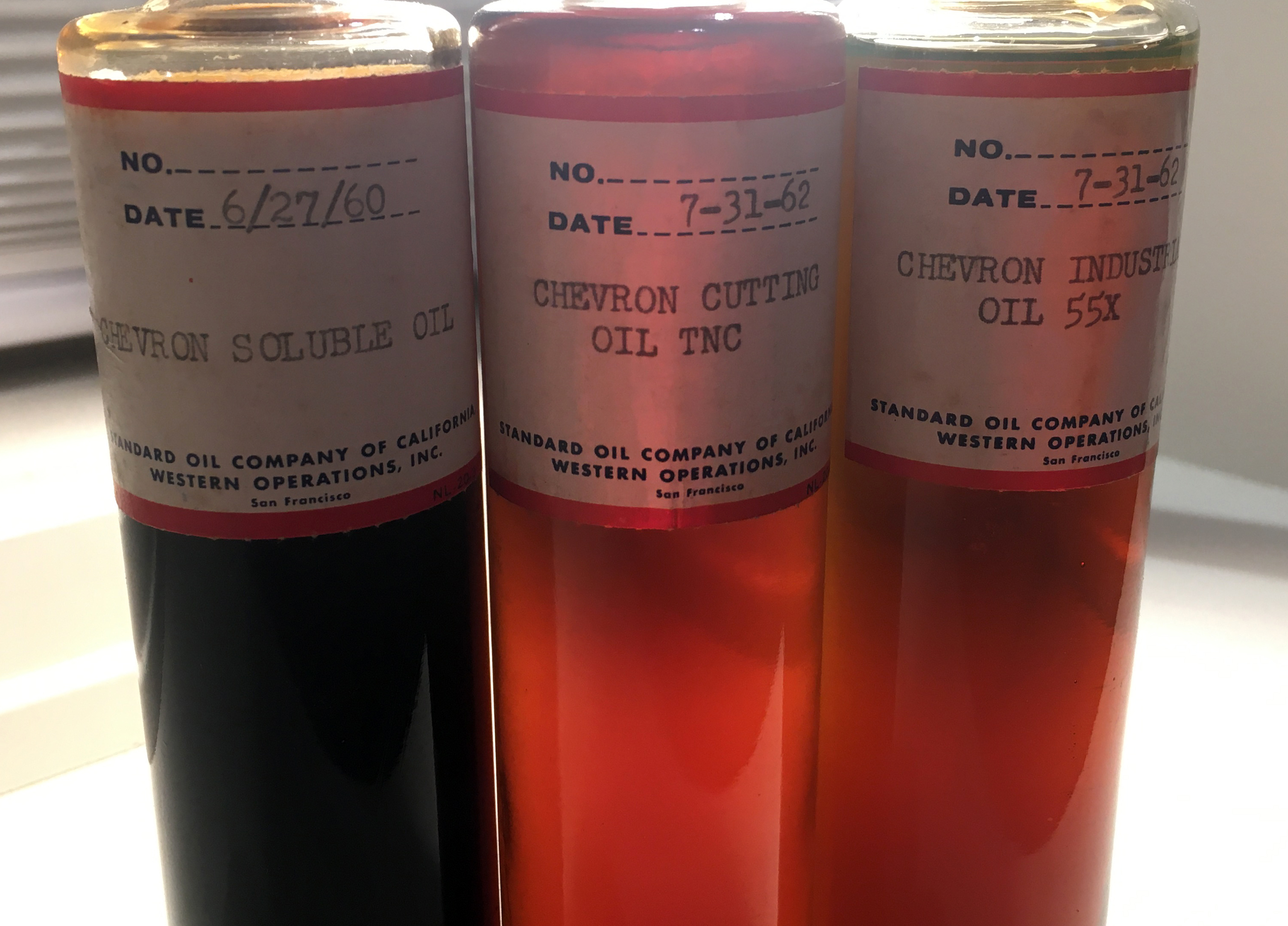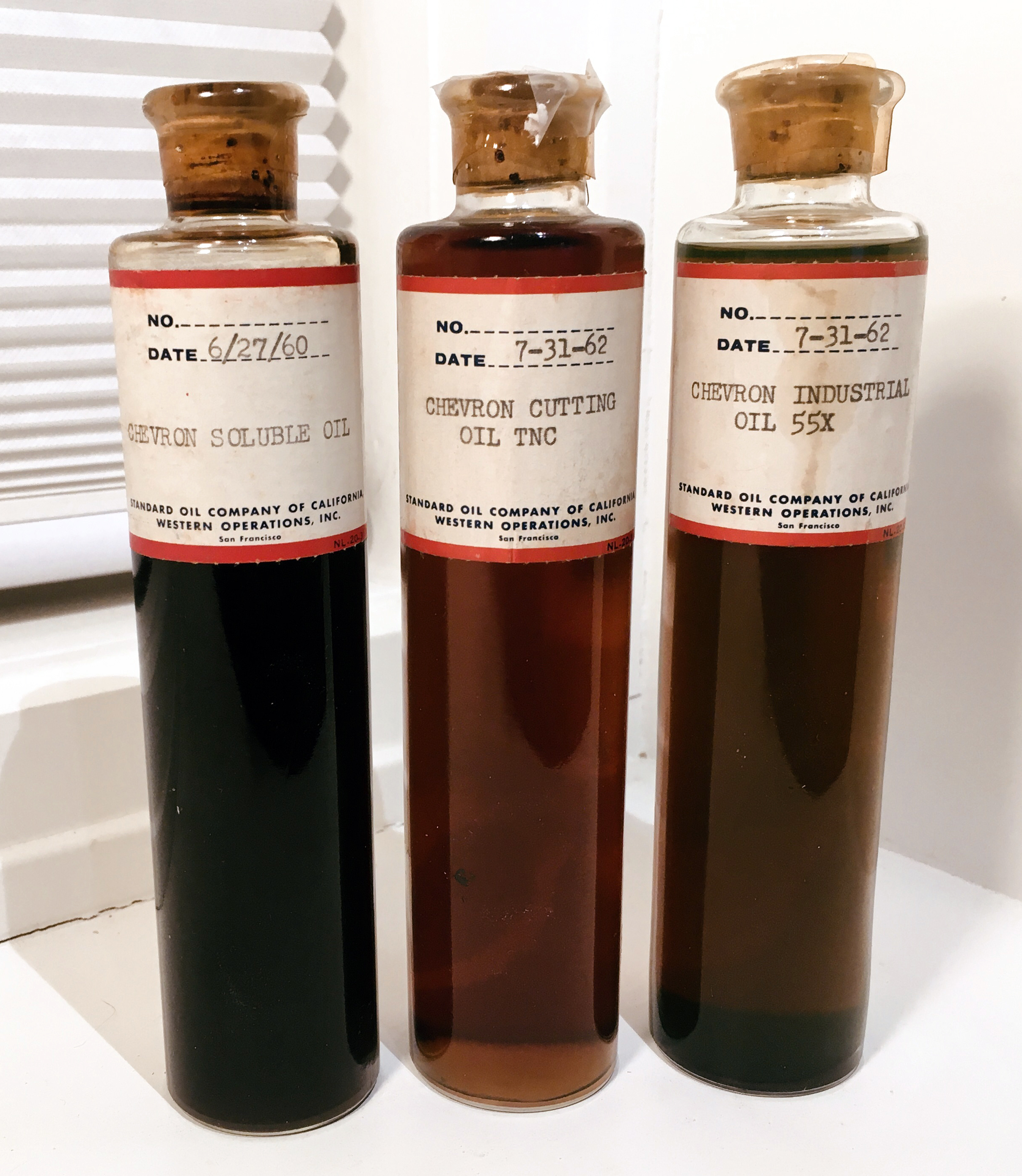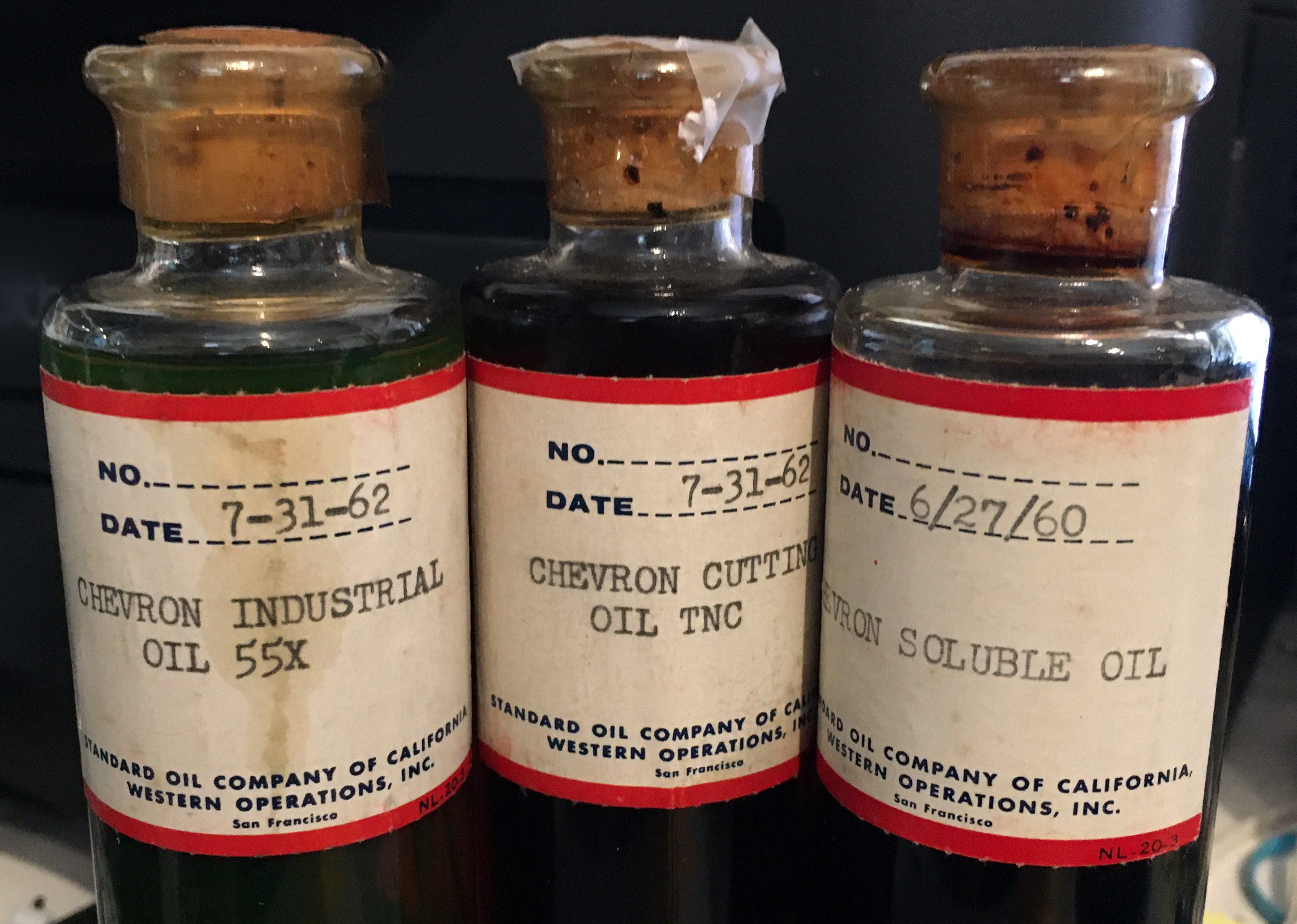 Standard Oil Company of California: Chevron industrial lubricants. Salesman's samples, 1960-1962. Three (3) glass bottles with cork stoppers. Each 6⅜" h., 1⅜" d. Standard Oil Company of California (SOCAL) traces its origins to Pico Canyon in the 1870s and was still producing in Pico Canyon when these samples were manufactured. Read the story here. At the time, "Chevron" was a trademark of Standard Oil. Later, "Standard Oil" would become a trademark of Chevron USA Inc. (1) Chevron Soluble Oil, mfg. June 27, 1960. A machine shop and cutting tool fluid. (2) Chevron Cutting Oil TNC, mfg. July 31, 1962. A metalworking fluid for use in machining operations. (3) Chevron Industrial Oil 55X, mfg. July 31, 1962. A high performance cylinder lubricant for slow-speed engines with high mechanical and thermal loads.