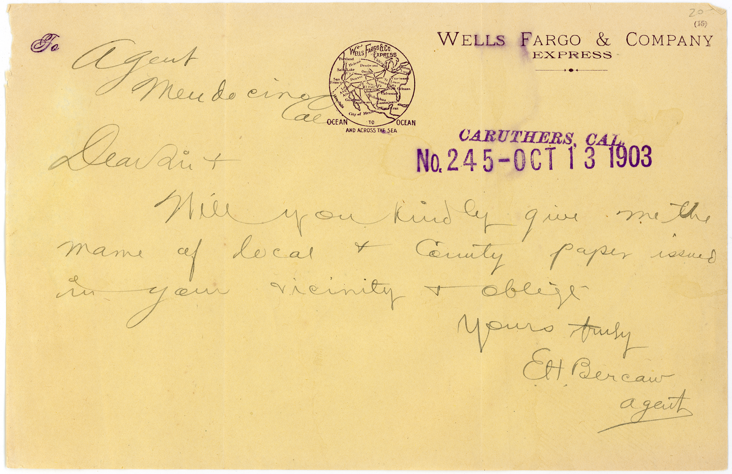 Agent-to-agent note on Wells Fargo & Co. Express letterhead, 8½x5½ inches (half page), dated October 13, 1903, from the Express and Southern Pacific station agent at Caruthers, Calif., Edward Hays "E.H." Bercaw — the older brother of Ora William Bercaw, who came to Saugus in 1906 as the Southern Pacific and Wells Fargo Express (package service) agent. Ora Bercaw, aka Ore or Orie, established the town of Surrey, which was renamed Saugus in 1915, and started a multi-generational family here. The town of Caruthers, south of Fresno, sported an SP No. 18 combination depot — passenger and freight — from 1891-1943 (Bender 2013:112). According to SP historian John Signor*, the station was located a mile post 211 on the railroad's Kerman to Goshen Junction line via Armona and Hanford. In the note above, E.H. Bercaw is asking the unidentified agent at Mendocino for the name of a local newspaper in the area. Back of note is blank. Records dug up by researcher Tricia Lemon Putnam show Edward Hays Bercaw (1875-1932) was born in Ohio, like his brother, and was employed as a railroad agent, like his brother, when he registered to vote in Fresno County in June 1903. By 1910, E.H. was working in Orange County as a store merchant, like his brother at Surrey/Saugus, and in 1930 he was appointed postmaster at Sepulveda, like his brother at Surrey/Saugus. By the latter date, Ora Bercaw was back in Glendale, where he had lived on and off since 1892 (Los Angeles Times, August 27, 1932). *Personal communication via Mike Jarel, 2022.