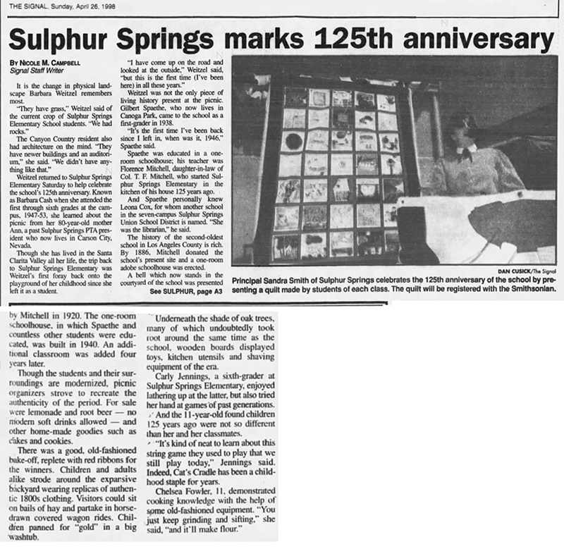 The Santa Clarita Valley's oldest school district, Sulphur Springs, was founded in 1872. While it might have been more accurate to celebrate its quasquicentennial (125th anniversary) in 1997,