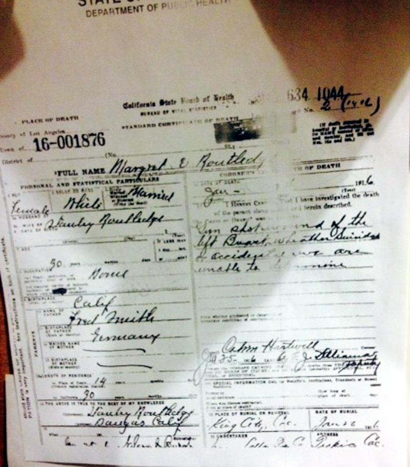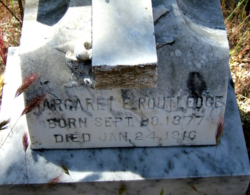 Margaret Routledge, nee Margaret E. Smith, hailed from Jolon in Monterey County. Margaret was born in California on Sept. 30, 1877; her father, Fred Smith, was born in Germany.