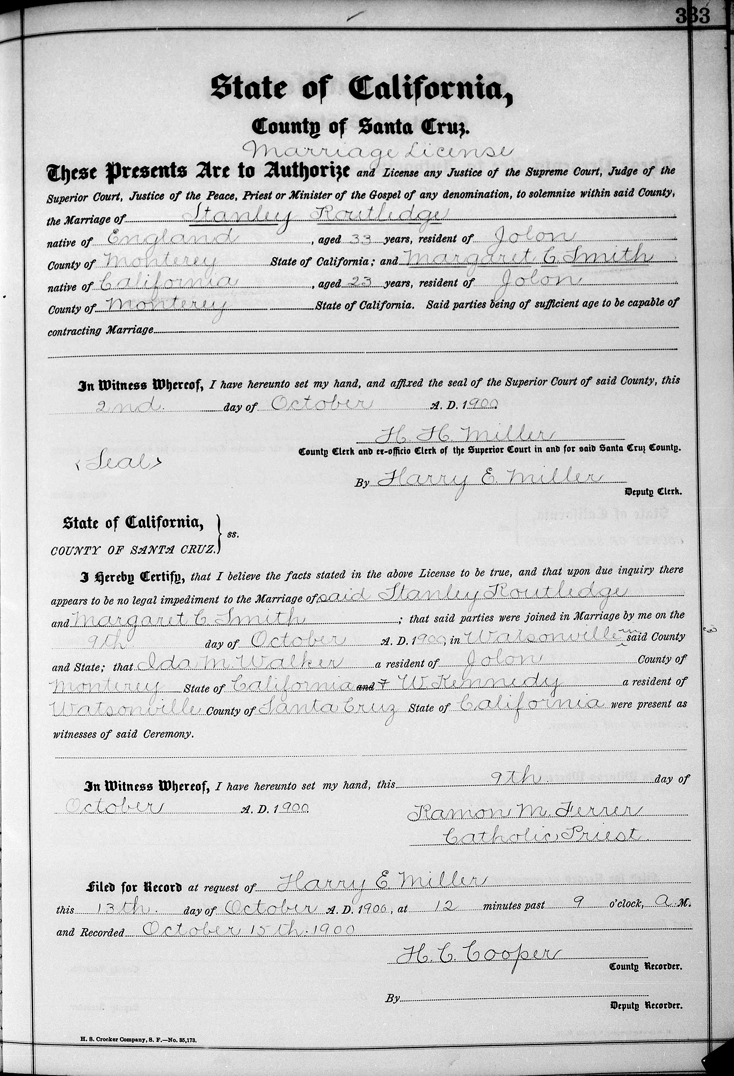 I hereby certify, that I believe the facts stated in the above license to be true, and that upon due inquiry there appears to be no legal impediment to the marriage of said Stanley Routledge and Margaret E. Smith; that said parties were joined in marriage by me on the 9th day of October, A.D. 1900, in Watsonville in said county and state; that Ida M. Walker, a resident of Jolon, county of Monterey, state of California, (and) W. Kennedy, a resident of Watsonville, county of Santa Cruz, state of California, were present as witnesses of said ceremony.