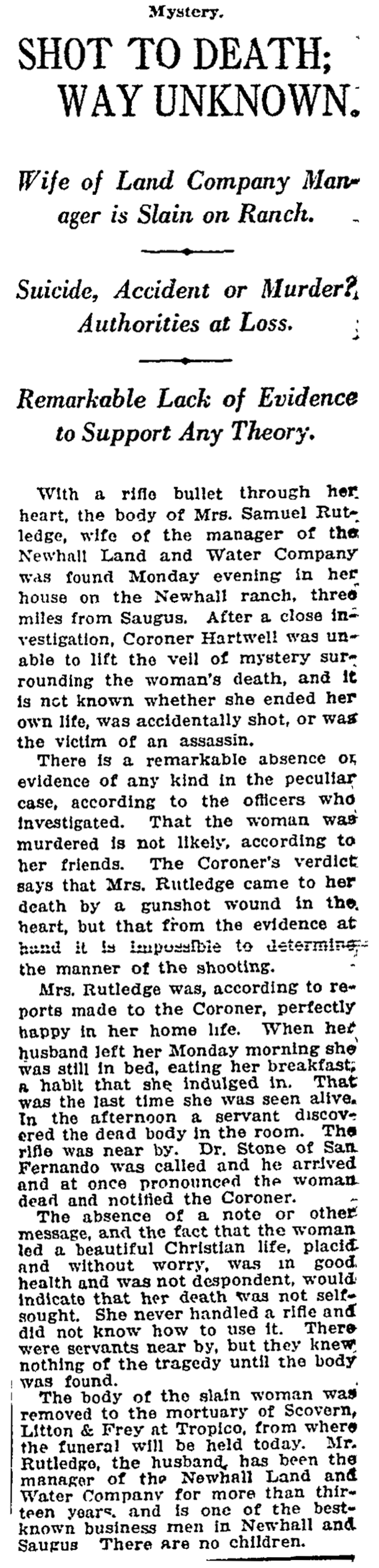 With a rifle bullet through her heart, the body of Mrs. Samuel Rutledge [sic: s/b Stanley Routledge], wife of the manager of the Newhall Land and Water Company [sic] was found Monday evening in her house on the Newhall ranch, three miles from Saugus. After a close investigation, Coroner Hartwell was unable to lift the veil of mystery surrounding the woman's death, and it is not known whether she ended her own life, was accidentally shot, or was the victim of an assassin.