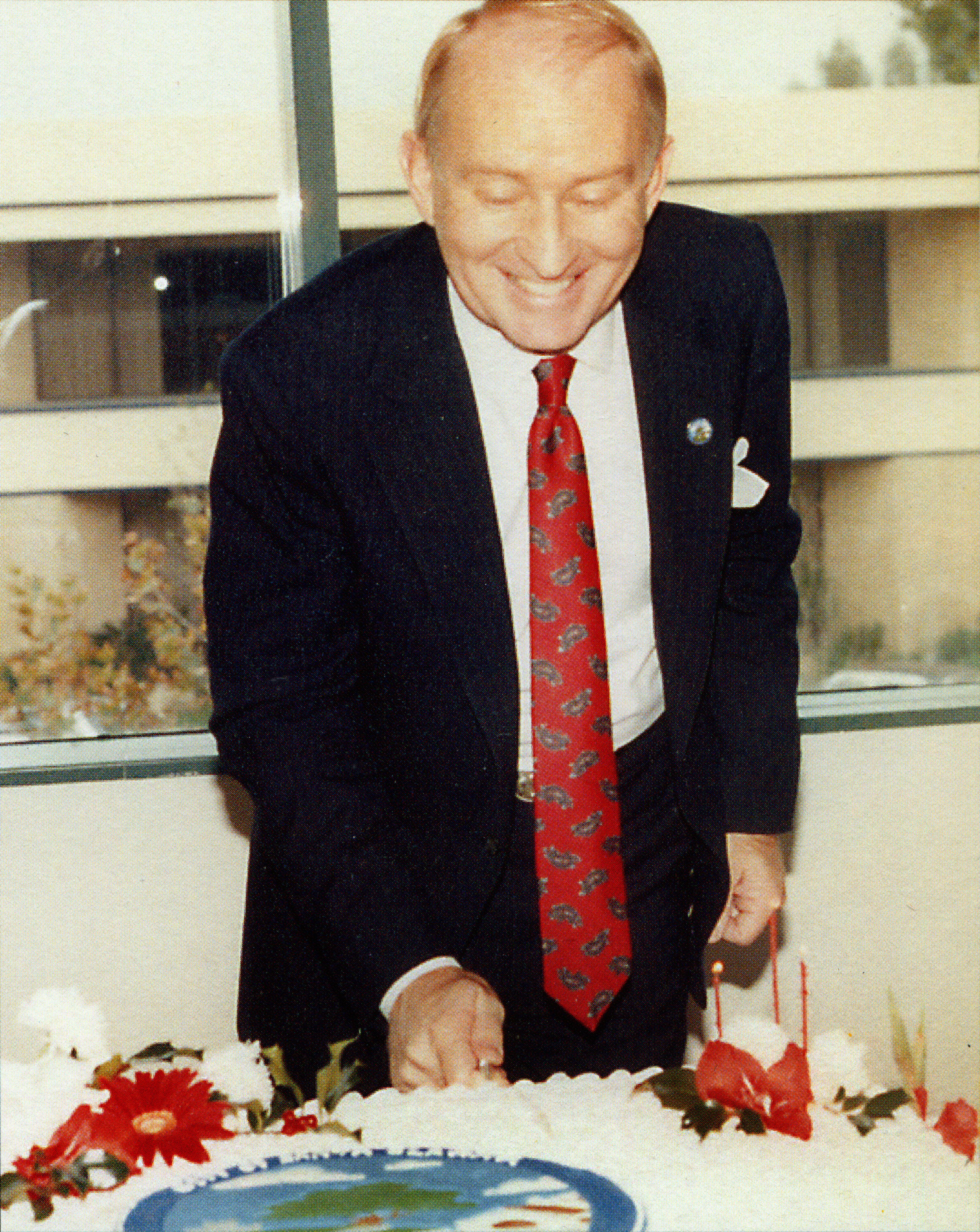 Howard "Buck" McKeon, Santa Clarita's first mayor, cuts the city's first birthday cake in December 1988. Photo: City of Santa Clarita. Click to enlarge.