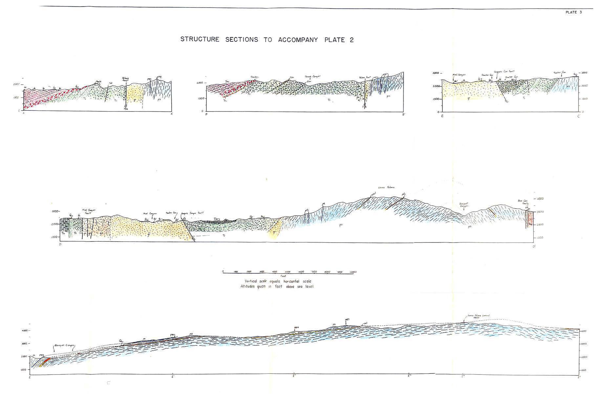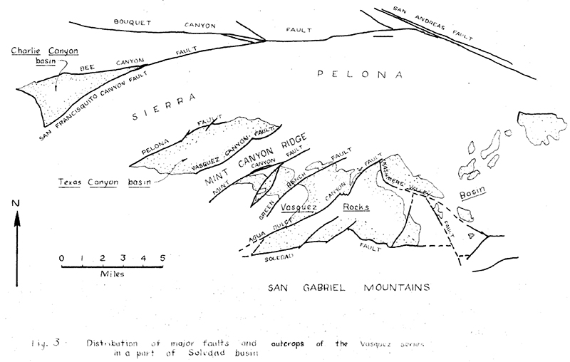 The numerous faults are the most prominent structural features of the Soledad basin. Normal faults which trend generally east were formed in post-Martinez, pre-Vasquez time. Displacements occurred throughout Vasquez time and ceased prior to Tick Canyon time. The Pelona fault may have been reactivated just prior to Mint Canyon time. Offsets on these normal faults are as much as 10,000 to 15,000 feet. The normal faults indicate that the minimum compressive stress was oriented nearly north-south. On the other hand, the post- Mint Canyon, pre-Saugus faults indicate a maximum compressive stress oriented north-south, which resulted in a number of northeasttrending left-hand faults with displacements up to 10,000 feet. None of the faults of the Soledad basin have been reactivated in spite of Pleistocene and Recent offsets along the San Andreas fault.