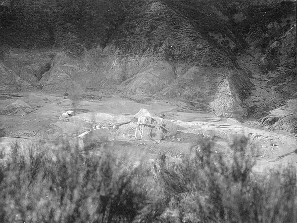 Photo No. 4 from The Newhall Land and Farming Co.'s March 24, 1928 report on the March 12-13 St. Francis Dam Disaster. There is no shadow covering the top third of this photograph; rather, the dark area is vegetation left behind after the water coursed below it, denuding the base of the mountain. | ||