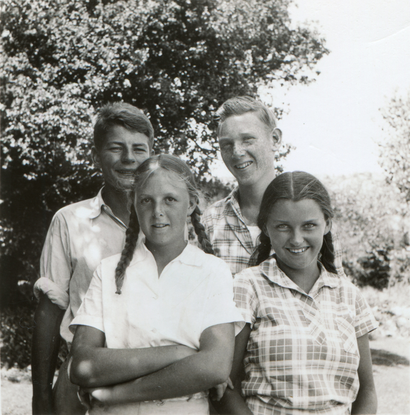 Front row: Ella "Cappy" Carey (left), Barbara Rübel; Back row: Gerald Rübel (left), Harry "Dobe" Carey Jr., probably at the Harry Carey Ranch in San Francisquito Canyon in about 1940. 2¼x2¼-inch print.