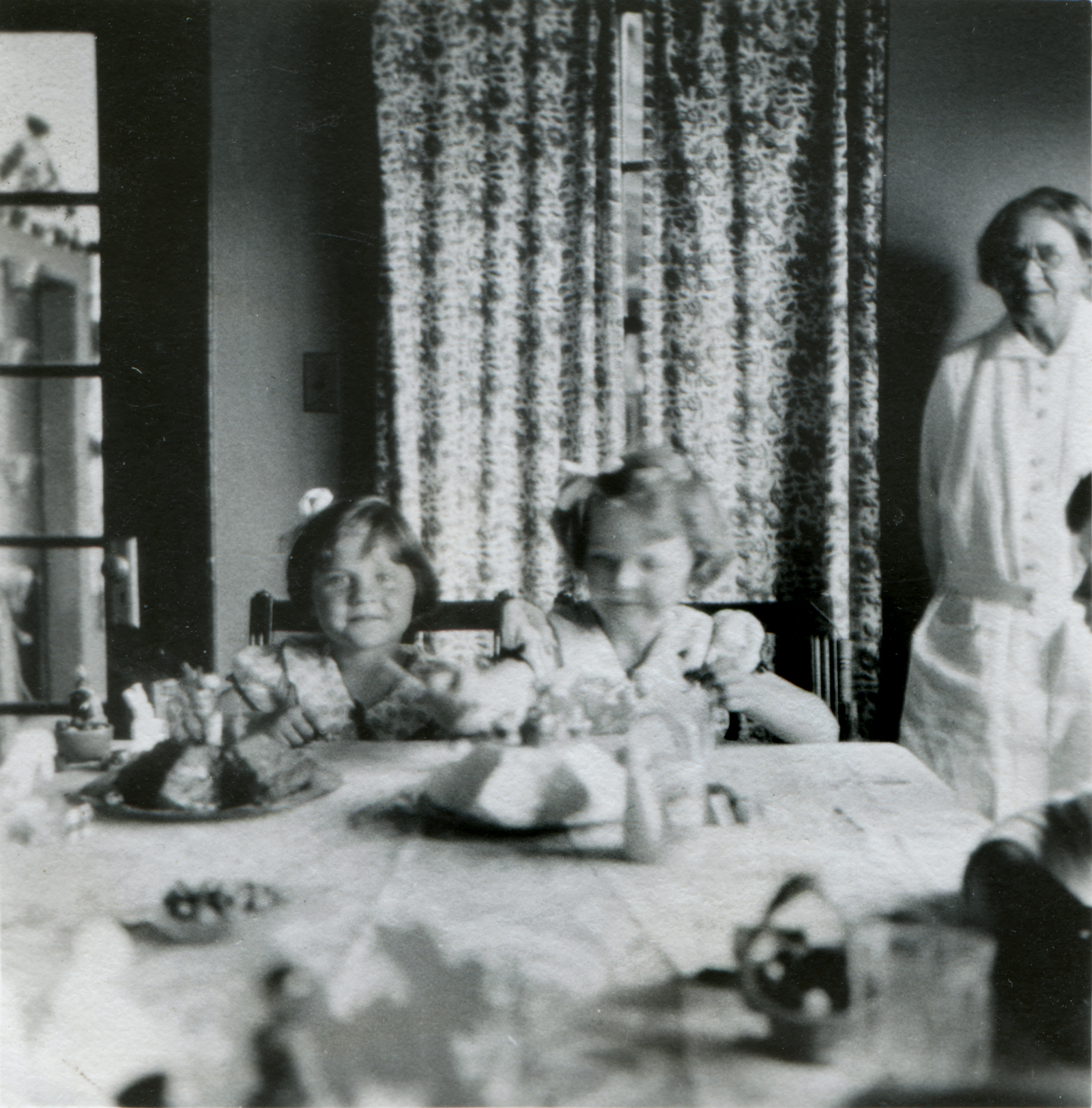 Nathalie Rübel (left) and her older sister Shirley celebrate their April birthdays together in their Rancho Camulos Adobe home, circa 1931. 2¼x2¼-inch print.