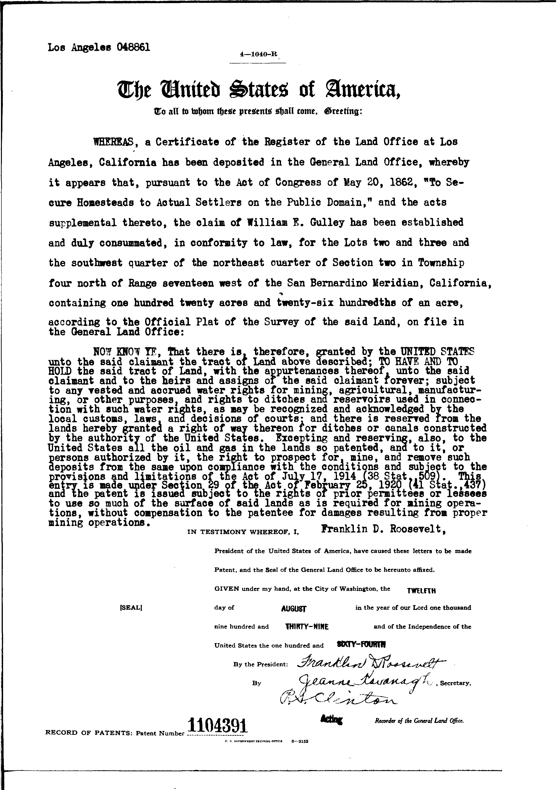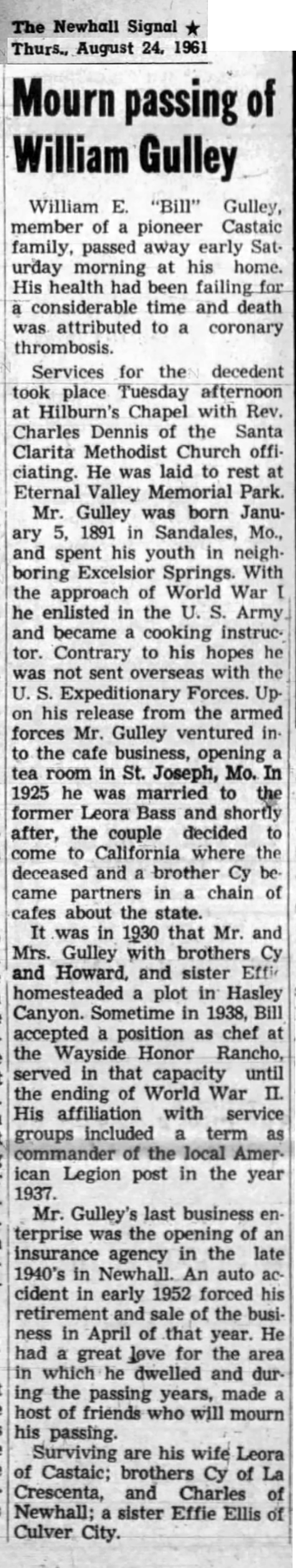 Mourn Passing of William Gulley. The Newhall Signal | Thursday, August 24, 1961. William E. "Bill" Gulley, member of a pioneer Castaic family, passed away early Saturday morning [August 19, 1961] at his home. His health had been failing for a considerable time and death was attributed to a coronary thrombosis. Services for the decedent took place Tuesday afternoon at Hilburn's Chapel with Rev. Charles Dennis of the Santa Clarita Methodist Church officiating. He was laid to rest at Eternal Valley Memorial Park. Mr. Gulley was born January 5, 1891, in Sandales, Mo., and spent his youth in neighboring Excelsior Springs. With the approach of World War I, he enlisted in the U.S. Army and became a cooking instructor. Contrary to his hopes, he was not sent overseas with the U.S. Expeditionary Forces. Upon his release from the armed forces, Mr. Gulley ventured into the cafe business, opening a tea room in St Joseph, Mo. In 1925 he was married to the former Leora Bass and shortly after, the couple decided to come to California where the deceased and a brother Cy became partners in a chain of cafes about the state. It was in 1930 that Mr. and Mrs. Gulley with brothers Cy and Howard and sister Effie homesteaded a plot in Hasley Canyon. [Land patent issued to William E. Gulley alone; see below — Ed.] Sometime in 1938, Bill accepted a position as chef at the Wayside Honor Rancho, served in that capacity until the ending of World War II. His affiliation with service groups included a term as commander of the local American Legion post in the year 1937. Mr. Gulley's last business enterprise was the opening of an insurance agency in the late 1940s in Newhall. An auto accident in early 1952 forced his retirement and sale of the business in April of that year. He had a great love for the area in which he dwelled and during the passing years, made a host of friends who will mourn his passing. Surviving are his wife Leora of Castaic; brothers Cy of La Crescenta and Charles of Newhall; a sister, Effie Ellis of Culver City.
