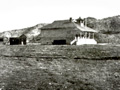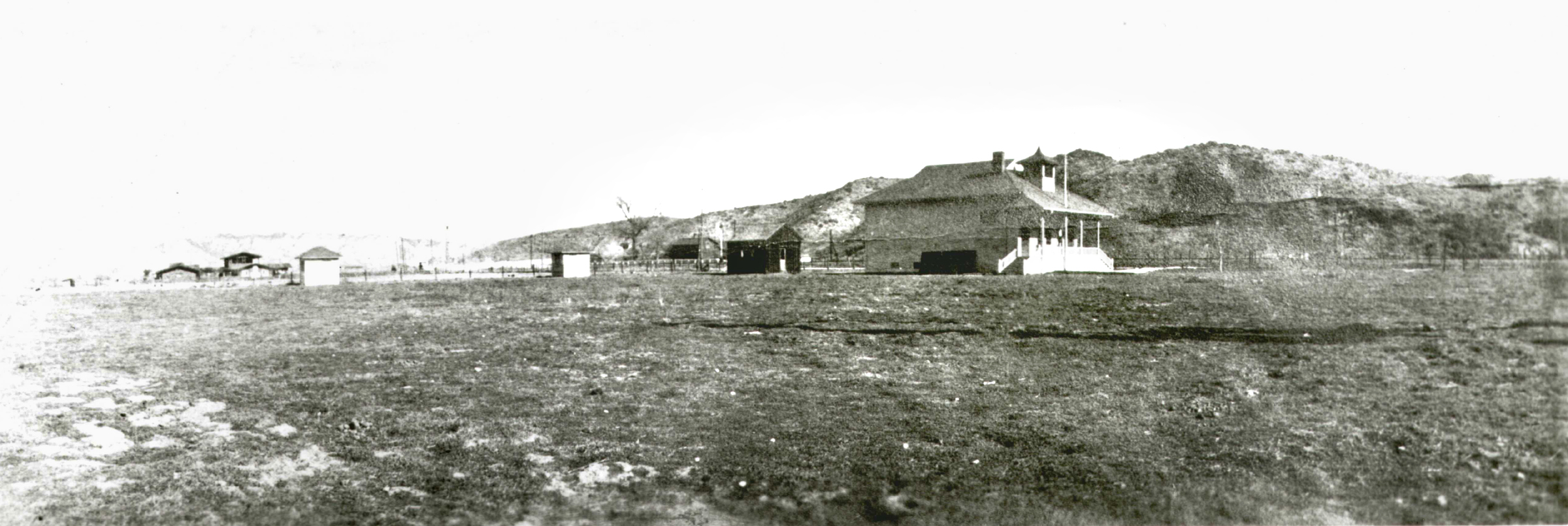 This photo is unique inasmuch as it is the only known image demonstrating that the schoolhouse faced south — unlike other Saugus buildings that fronted Bouquet Canyon Road and faced east. Here, we see what would become the Bermite hills in the background. Other photos do not offer perspective. Also, this must be the earliest photo, because the bell tower has a pointed top, possibly a finial. It doesn't show up in other early photographs. Perhaps it blew off in in the wind, or maybe some pranksters absconded with it.
