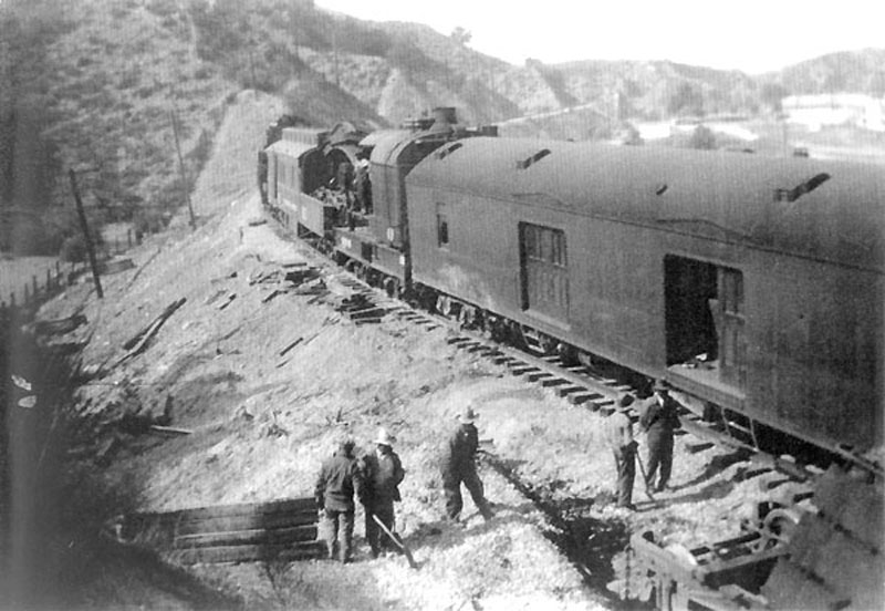 The most spectacular local robbery occurred during the early evening of Nov. 10, 1929. After pulling into the Saugus Station for water, a massive three-barreled steam locomotive of the 5000 series left at 7:40 p.m., rounding the bend at Bouquet Junction, then starting to gather speed as she headed out Soledad Canyon. Suddenly Engine No. 59 began to lurch violently back and forth. Then, after chewing up 600 yards of track, it crashed over on its side as a torrent of flaming red sparks flew from spinning drivers. The engineer barely escaped being scalded to death as his steamer slid to a halt behind the Saugus Speedway [then the Baker Ranch Stadium].