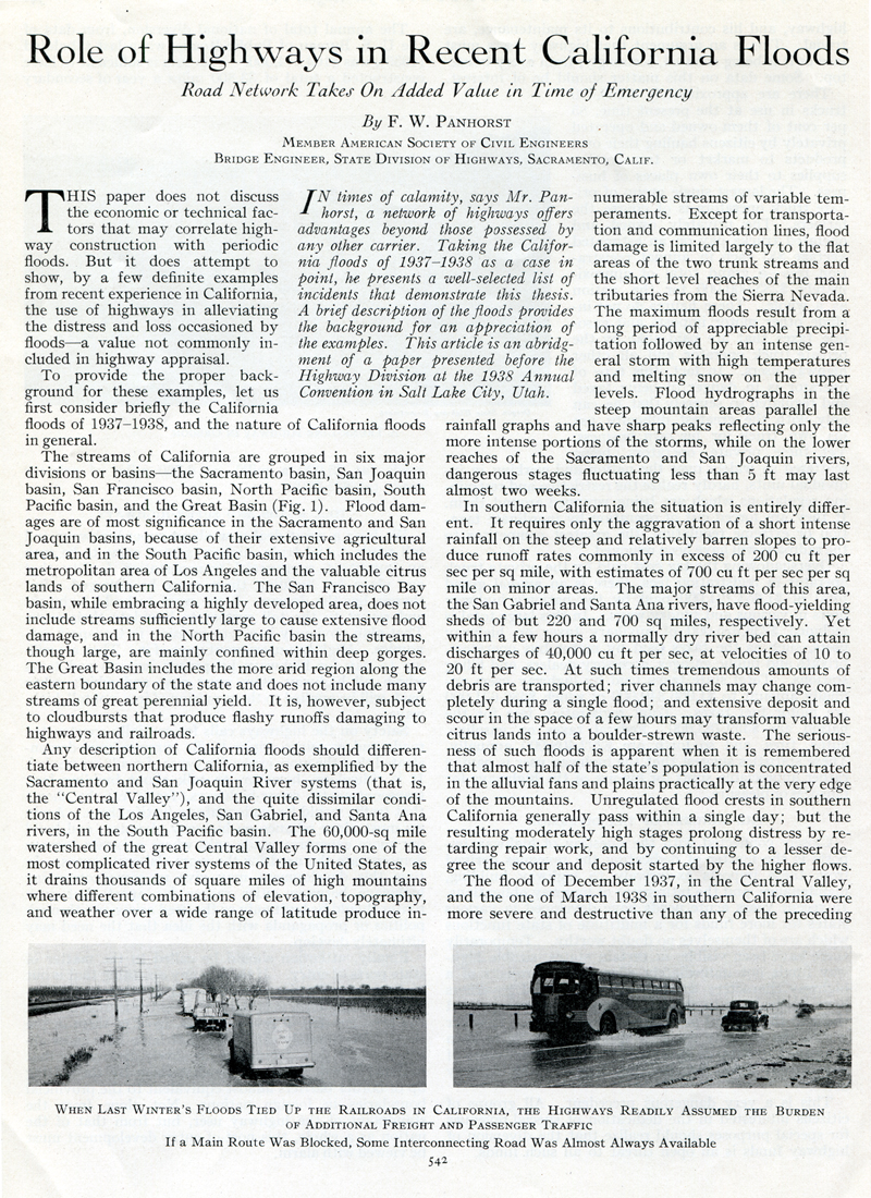 This paper does not discuss the economic or technical factors that may correlate highway construction with periodic floods. But it does attempt to show, by a few definite examples from recent experience in California, the use of highways in alleviating the distress and loss occasioned by floods — a value not commonly included in highway appraisal.