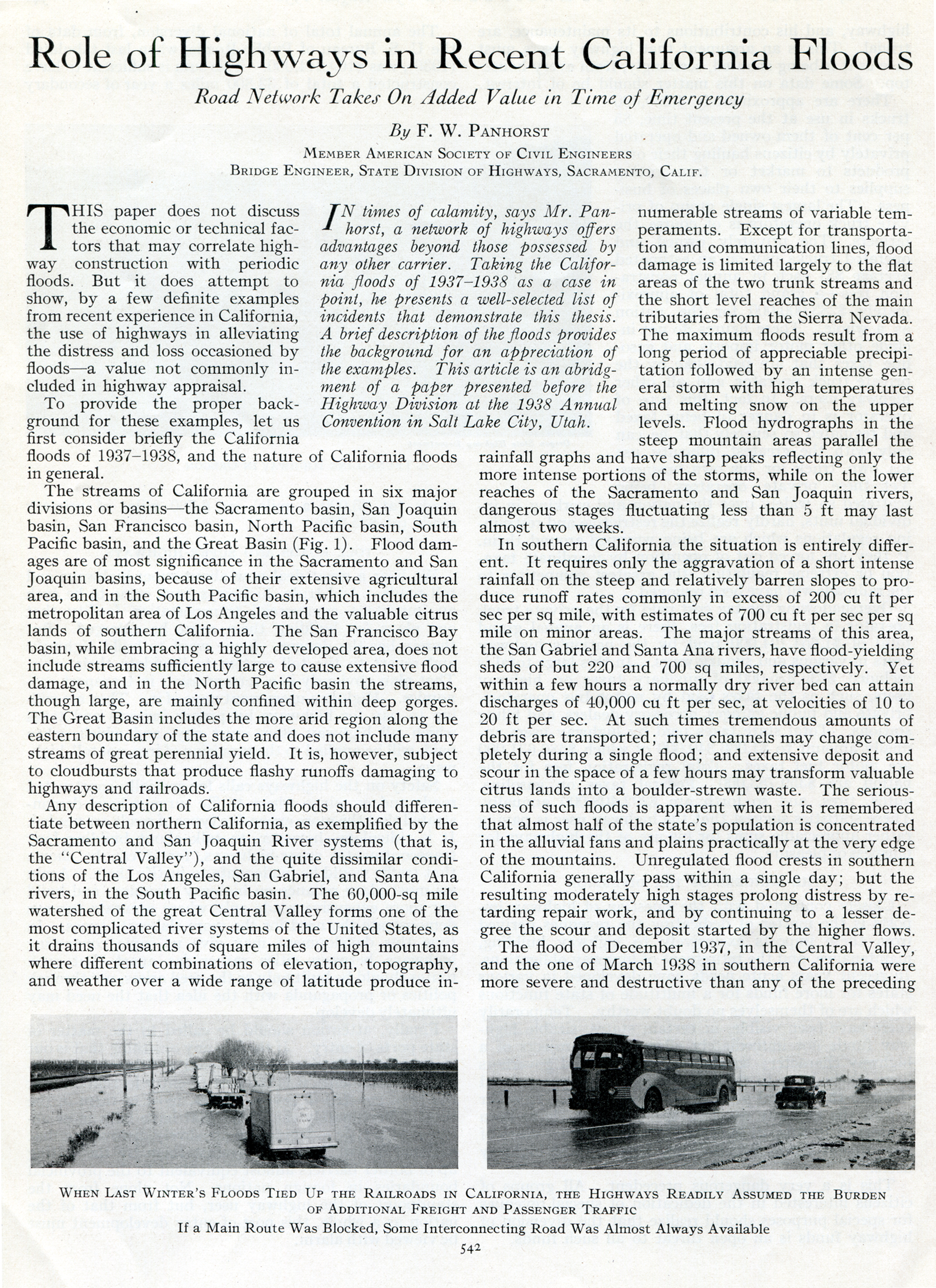 In times of calamity, says Mr. Panhorst, a network of highways offers advantages beyond those possessed by any other carrier. Taking the California floods of 1937-1938 as a case in point, he presents a well-selected list of incidents that demonstrate this thesis. A brief description of the floods provides the background for an appreciation of the examples. This article is an abridgment of a paper presented before the Highway Division at the 1938 Annual Convention in Salt Lake City, Utah.