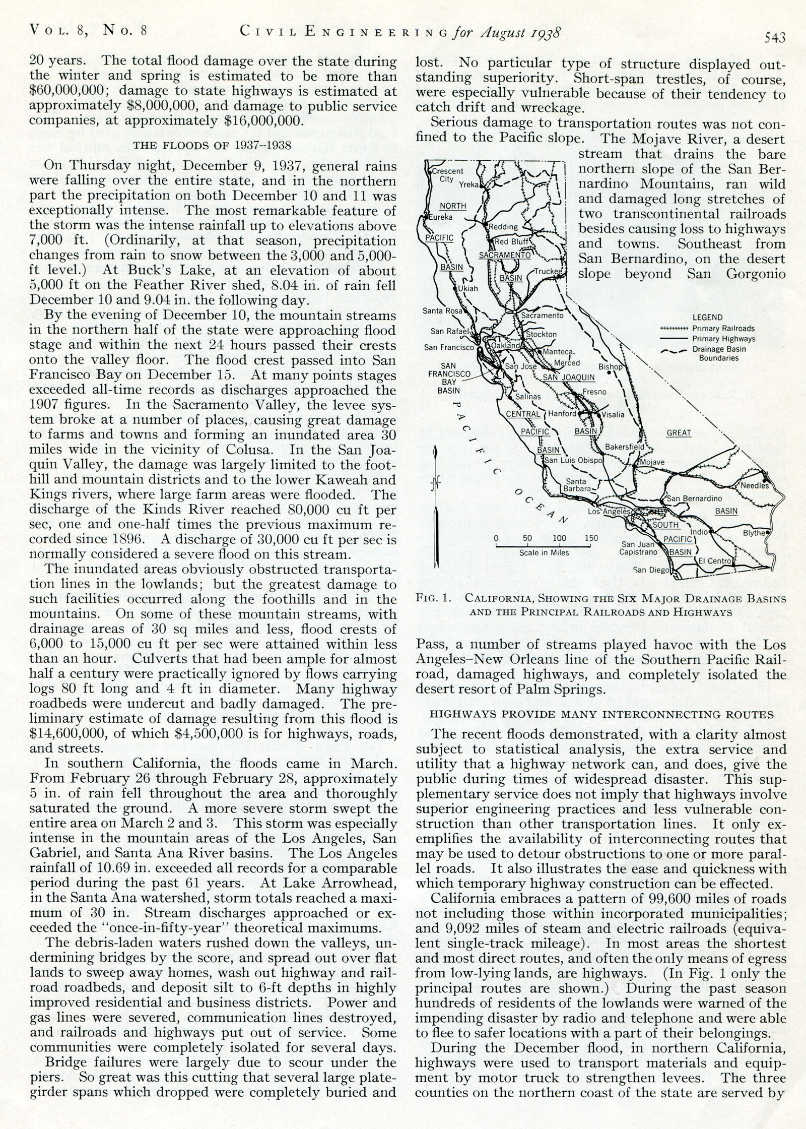 California embraces a pattern of 99,600 miles of roads not including those within incorporated municipalities; and 9,092 miles of stream and electric railroads (equivalent single-track mileage). In most areas the shortest and most direct routes, and often the only means of egress from low-lying lands, are highways. (In Fig. 1 only the principal routes are shown.) During the past season hundreds of residents of the lowlands were warned of the impending disaster by radio and telephone and were able to flee to safer locations with a part of their belongings.