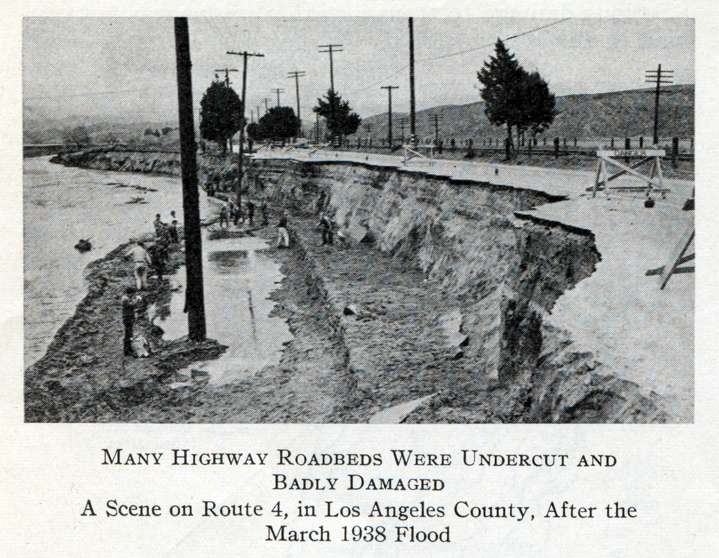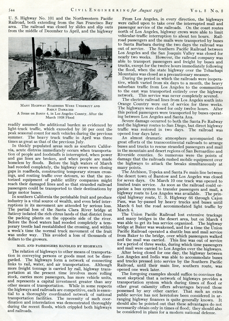 In thickly populated areas such as southern California, acute distress immediately occurs when transportation of people and foodstuffs is interrupted, when power and gas lines are broken, and when people are made homeless by floods. Before the high waters of March had receded completely, the highway crews were closing gaps in roadbeds, constructing temporary stream crossings, and routing traffic over detours, so that the motorized equipment of public utility companies might reach their damaged lines and so that stranded railroad passengers could be transported to their destinations by large motor buses.