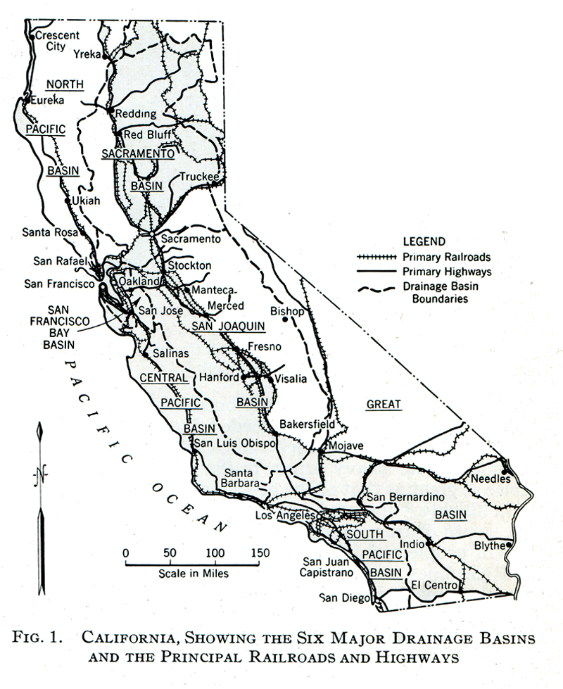The streams of California are grouped in six major divisions or basins — the Sacramento basin, San Joaquin basin, San Francisco basin, North Pacific basin, South Pacific basin, and the Great Basin (Fig. 1) [below]. Flood damages are of most significance in the Sacramento and San Joaquin basins, because of their extensive agricultural area, and in the South Pacific basin, which includes the metropolitan area of Los Angeles and the valuable citrus lands of southern California. The San Francisco Bay basin, while embracing a highly developed area, does not include streams sufficiently large to cause extensive flood damage, and in the North Pacific basin the streams, though large, are mainly confined within deep gorges. The Great Basin includes the more arid region along the eastern boundary of the state and does not include many streams of great perennial yield. It is, however, subject to cloudbursts that produce flashy runoffs damaging to highways and railroads.