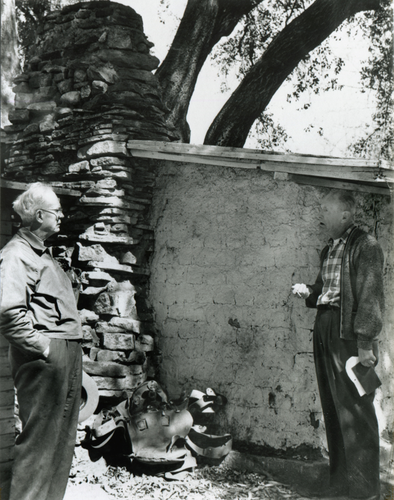 Walter Murphy (left), son-in-law of Thomas F. Mitchell, with A.B. Perkins at the Mitchell adobe in the early 1960s. It was the first structure known to have