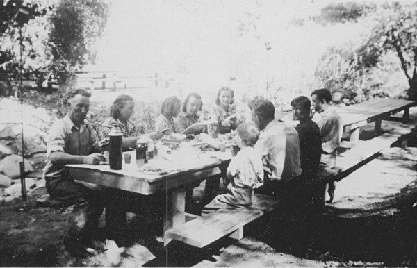 The Westcotts and their friends, the Morraines, at the picnic grounds (Johnson Park) in Pico Canyon, 1939. Note the two torches, one at extreme left and the other in the background. Gas feeds through the pipes, which are capped with tin cans when not in use (as in this photo). | ||