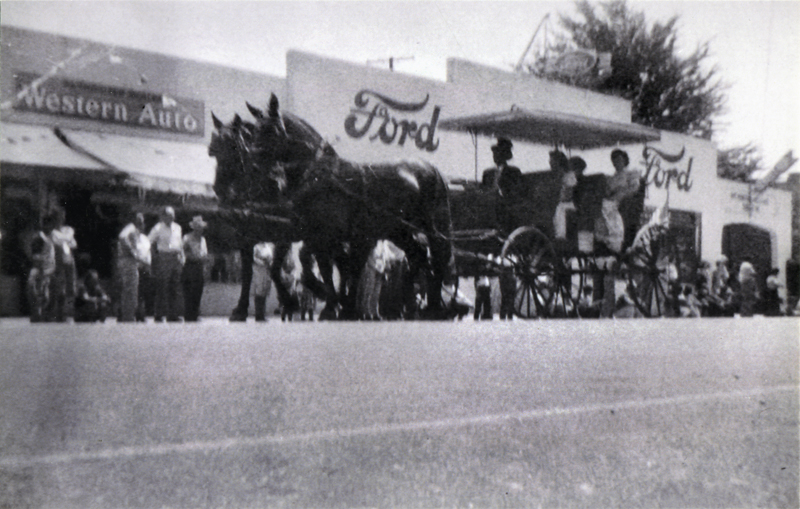 Newhall Fourth of July Parade, 1946. Unidentified parade entry passes in front of Clymore Ford (Clymore Motors), which had been Doty Ford and which eventually became Magic Ford, which moved to Creekside Road in Valencia in the 1970s. In 1946 it had a three-digit address and the street name was Spruce; as of 2013 the address is 24254 Main Street and the old showroom houses a private car collection with the business name, The Source.