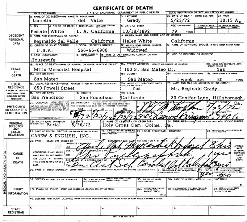 Lucretia outlived her husband by nearly 15 years. She was 79 when she died at Mills Memorial Hospital in San Mateo, not far from her home at 850 Powell Street in San Francisco. She is buried alongside her husband at Holy Cross Catholic Cemetery in Colma (San Mateo County). The couple had four children: Reginaldo del Valle Grady (1918-1997), Patricia Louise Grady Davies (1920-2000), Henry Grady and John Grady.