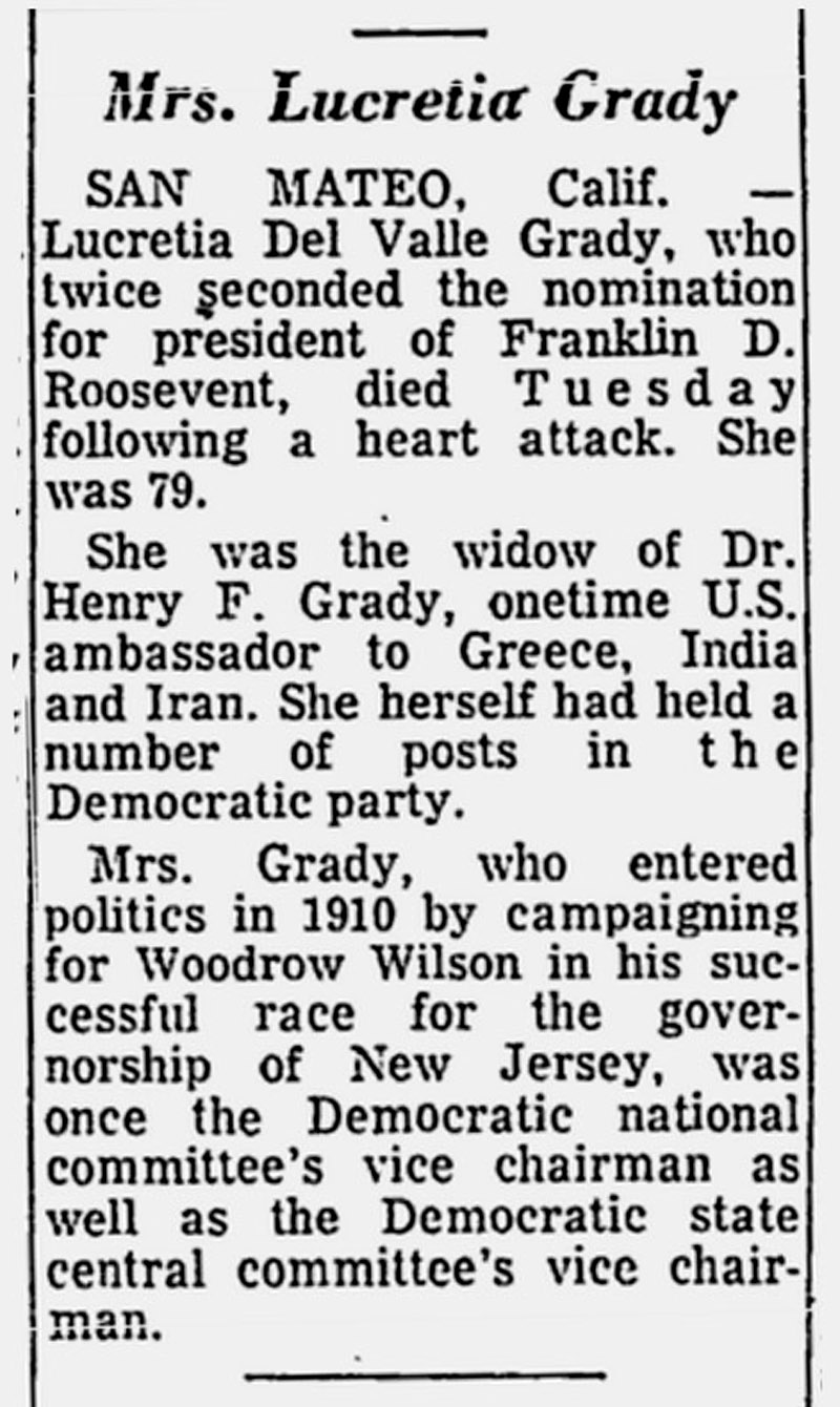 San Mateo, Calif. — Lucretia del Valle Grady, who twice seconded the nomination for president of Franklin D. Roosevelt, died Tuesday following a heart attack. She was 79.