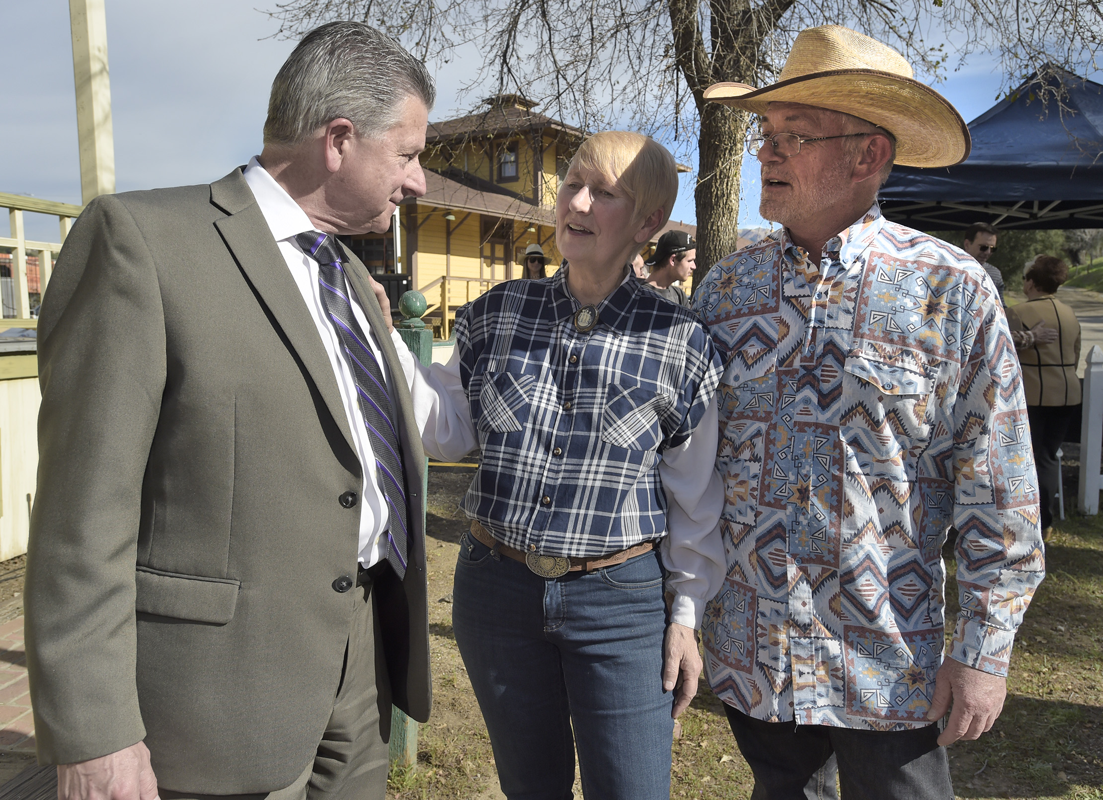 FivePoint Community President Don Kimball, left, Santa Clarita Valley Historical Society board member Laurene Weste and Vice President Leon Worden chat after Kimball presented a $25,000