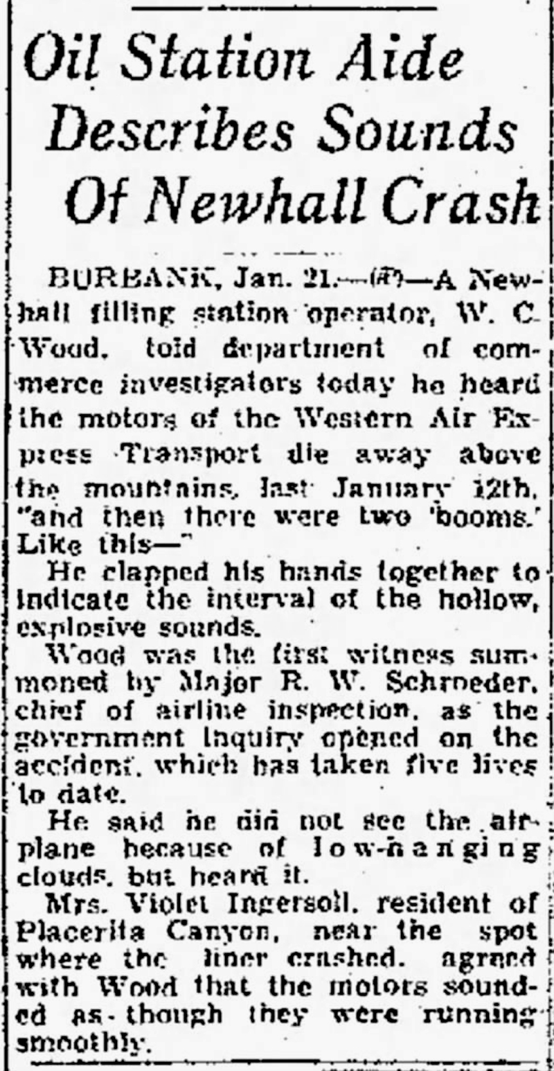 Burbank, Jan. 21 — (AP) — A Newhall filling station operator, W.C. Wood, told department of commerce investigators today he heard the motors of the Western Express Transport die away above the mountains last January 12th, "and then there were two 'booms.' Like this —"