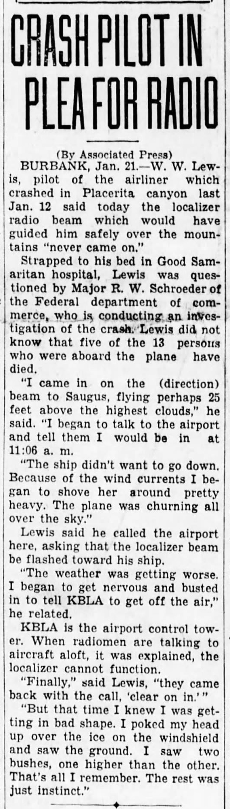 Burbank, Jan. 21 — W.W. Lewis, pilot of the airliner which crashed in Placerita canyon last Jan. 12 said today the localizer radio beam which would have guided him safely over the mountains "never came on."