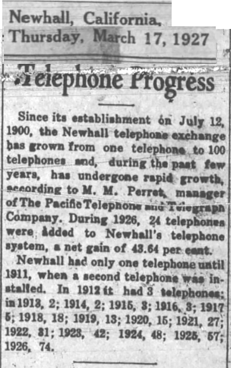 Newhall had only one telephone until 1911, when a second telephone was installed. In 1912 it had 3 telephones; in 1913, 2; 1914, 2, 1915, 3; 1916, 3; 1917, 5; 1918, 18; 1919, 13; 1920, 15; 1921, 27; 1922, 31; 1923, 42; 1924, 48; 1925, 57; 1926, 74.