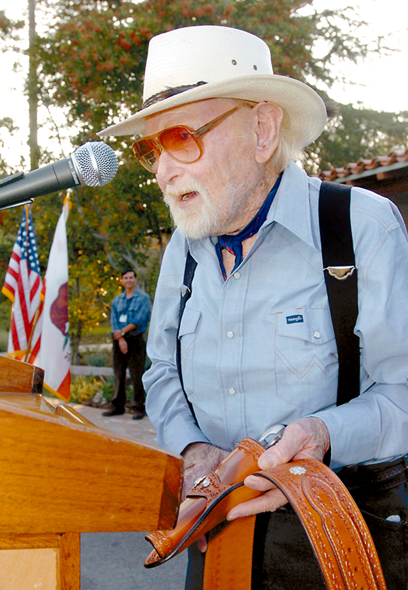 Thursday, Nov. 3, 2005: Actor Harry Carey Jr. ("Dobe") addresses the crowd at the dedication of his childhood home as a county park, while holding a pistol and gun belt given to him by Raymond Walter, editor of Shoot magazine, to mark the occasion.
