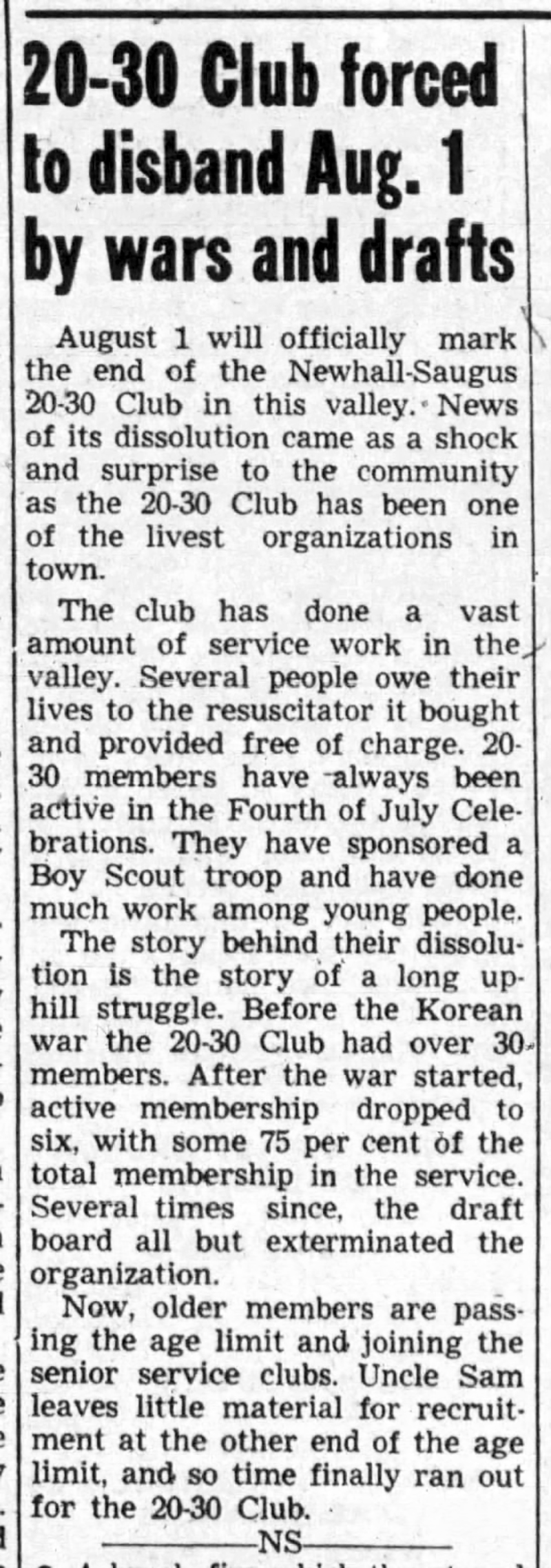 August 1 will officially mark the end of the Newhall-Saugus 20-30 Club in this valley. News of its dissolution came as a shock and surprise to the community as the 20-30 Club has been one of the (liveliest) organizations in town.