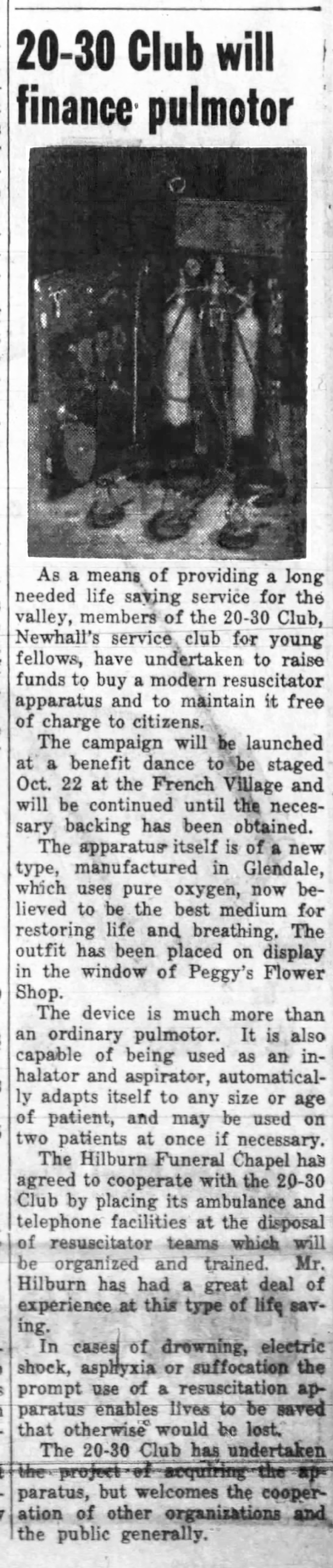 As a means of providing a long needed life saving service for the valley, members of the 20-30 Club, Newhall's service club for young fellows, have undertaken to raise funds to buy a modern resuscitator apparatus and to maintain it free of charge to citizens.