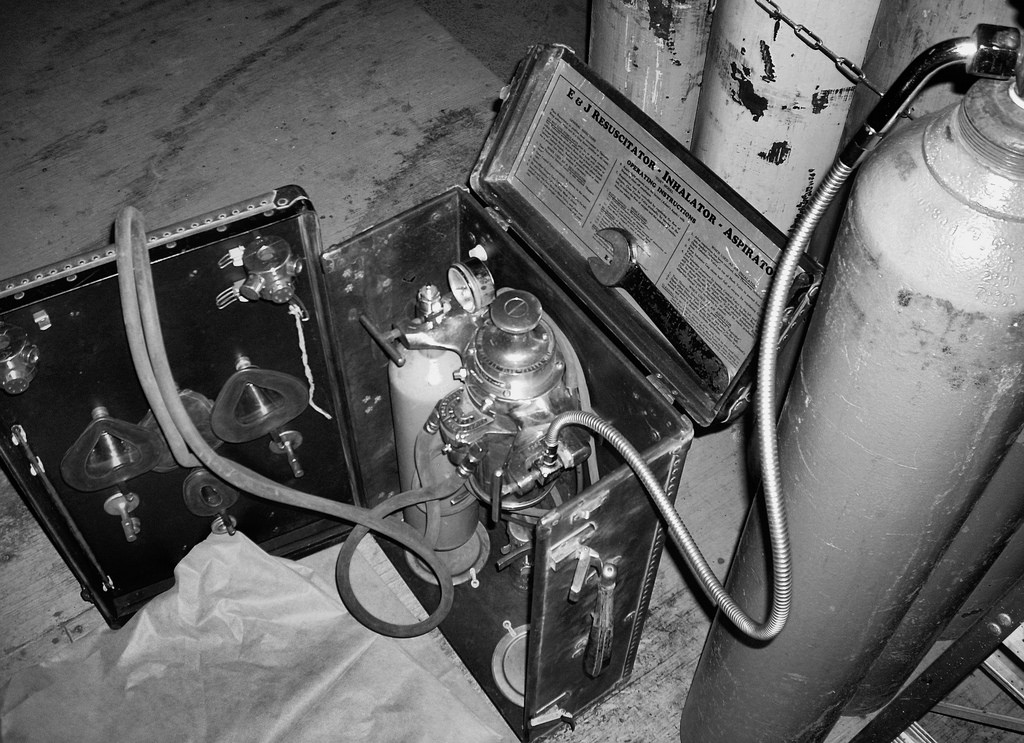 The device was probably an E&J Resuscitator-Inhalator-Aspirator like this one (but not this exact one) by E&J Manufacturing Co. of Glendale, Calif. Click to enlarge.