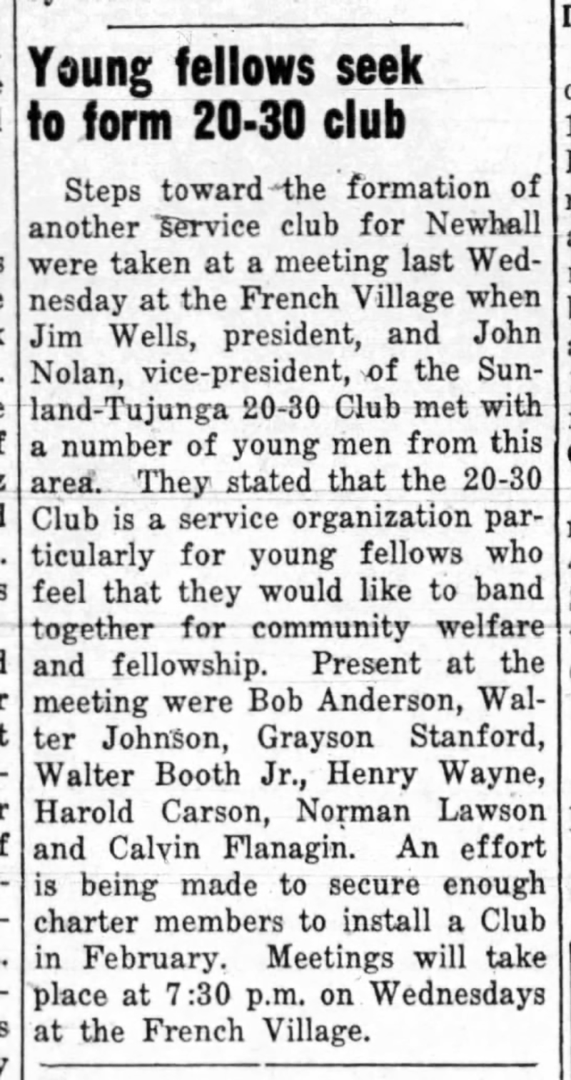 Steps toward the formation of another service club for Newhall were taken at a meeting last Wednesday at the French Village when Jim Wells, president, and John Nolan, vice-president, of the Sunland-Tujunga 20-30 Club met with a number of young men from this area.