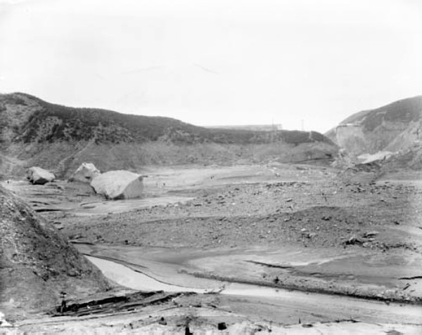 Large concrete blocks have been washed downriver from their original location at the right of this photograph following the St. Francis Dam disaster of March 12-13, 1928. Some of the "specks" in this photo are people examining the wreckage that dwarfs them. | ||