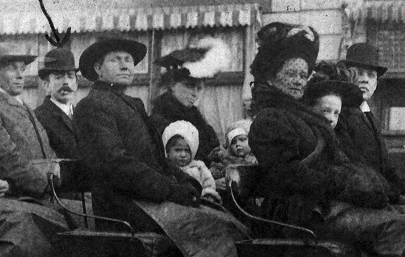 "Brother Fred sent me this card. He is in back seat, one with mustache. His wife Em [Emma] in seat in front of him, holding baby. Think Pricilla his daughter is in second seat from front seat. Denver, United States."