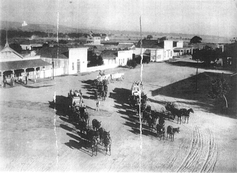 Mule teams continued to bring feed and supplies into Newhall long after the first trains came through town in 1876. This photograph, probably taken from the roof of the potato warehouse at the southeast corner of Railroad Avenue and Market Street, shows downtown Newhall as it looked in 1887. The shadow of the Newhall Depot, which sat at the southwest corner, is visible at right.
