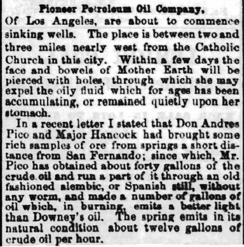 In a recent letter I stated that Don Andres Pico and Major Hancock had brought some rich samples of ore from springs a short distance from the San Fernando; since which, Mr. Pico has obtained about forty gallons of the crude oil and run a part of it through an old fashioned alembic, or Spanish still, without any worm, and made a number of gallons of oil which, in burning, emits a better light than Downey’s oil. The spring emits in its natural condition about twelve gallons of crude oil per hour.
