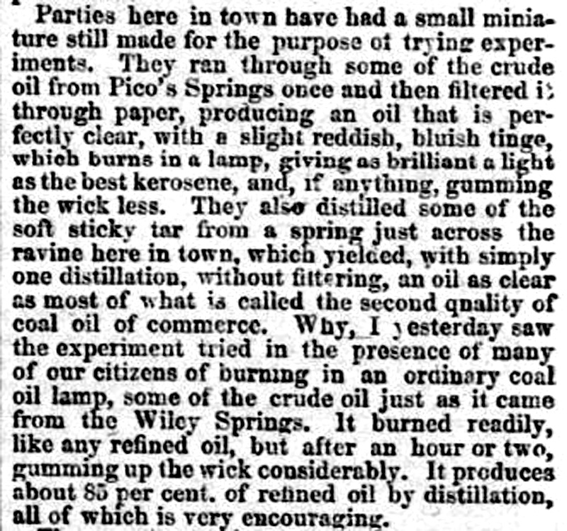 Parties here in town have had a small miniature still made for the purpose of trying experiments. They ran through some of the crude oil from Pico’s Springs once and then filtered it through paper, producing an oil that is perfectly clear, with a slight reddish, bluish tinge, which burns in a lamp, giving as brilliant a light as the best kerosene, and, if anything, gumming the wick less. They also distilled some of the soft sticky tar from a spring just across the ravine here in town, which yielded, with simply one distillation, without filtering, an oil as clear as most of what is called the second quality of coal oil of commerce. Why, I yesterday saw the experiment tried in the presence of many of our citizens of burning in an ordinary coal oil lamp, some of the crude oil just as it came from the Wiley Springs. It burned readily, like any refined oil, but after an hour or two, gumming up the wick considerably. It produces about 85 per cent. of refined oil by distillation, all of which is very encouraging.