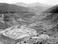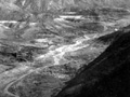 Here the flood dammed up for a moment, then swept forward again with renewed fury. Jim Barry swooped low between the hills to give Steene a chance to record the scene of the waters plunging down hill on its drive toward the next town.