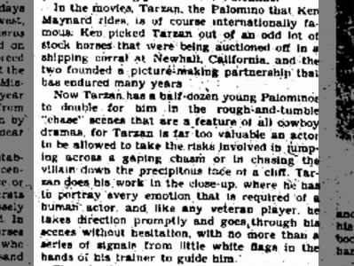 Another article from The Times (San Mateo, Calif.) of Jan. 2, 1937, adds some detail about the purchase: "Ken picked Tarzan out of an odd lot of stock horses that were being auctioned off in a shipping corral at Newhall, California, and the two founded a picture-making partnership that has endured many years."