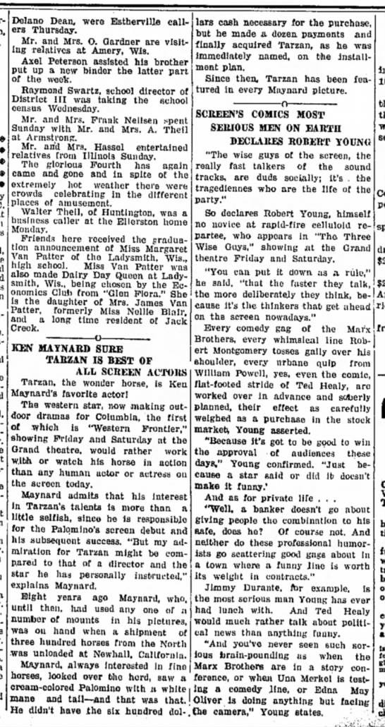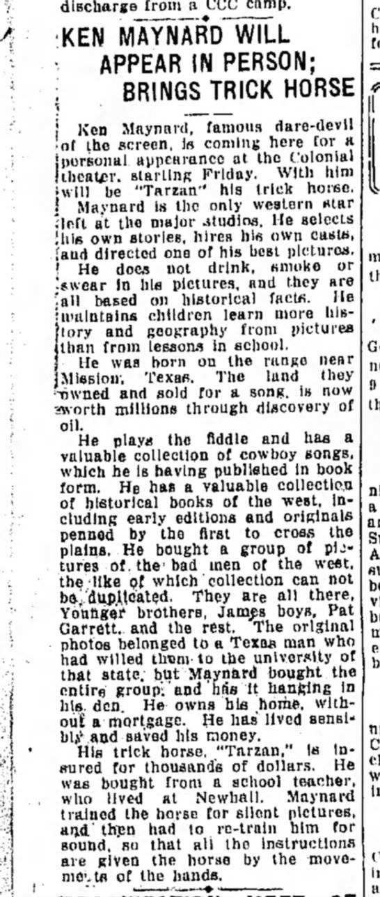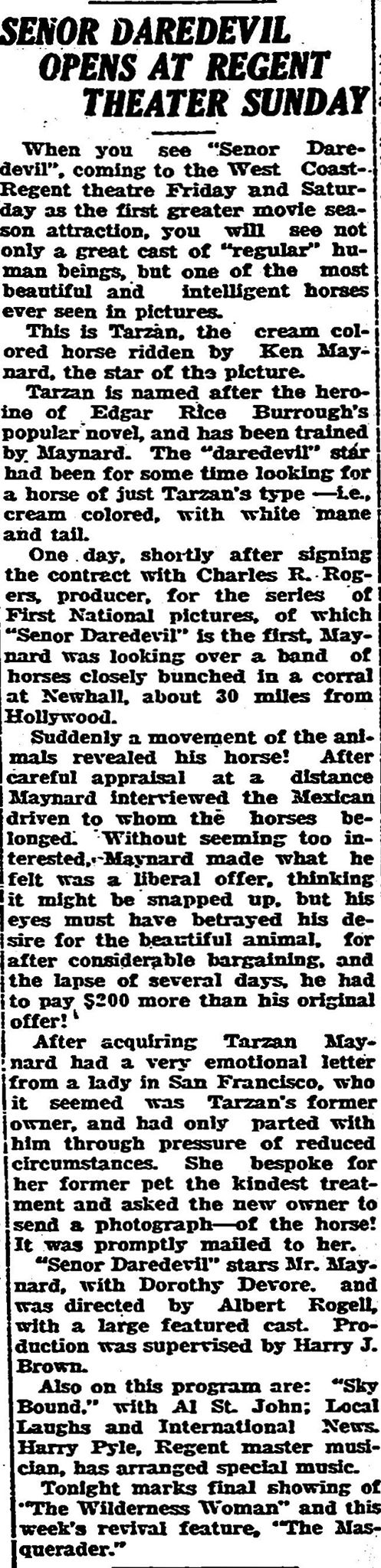 "(Maynard's) trick horse, 'Tarzan,' is insured for thousands of dollars. He was bought from a school teacher, who lived at Newhall. Maynard trained the horse for silent pictures, and then had to re-train him for sound, so that all the instructions are given the horse by the movements of the hands."