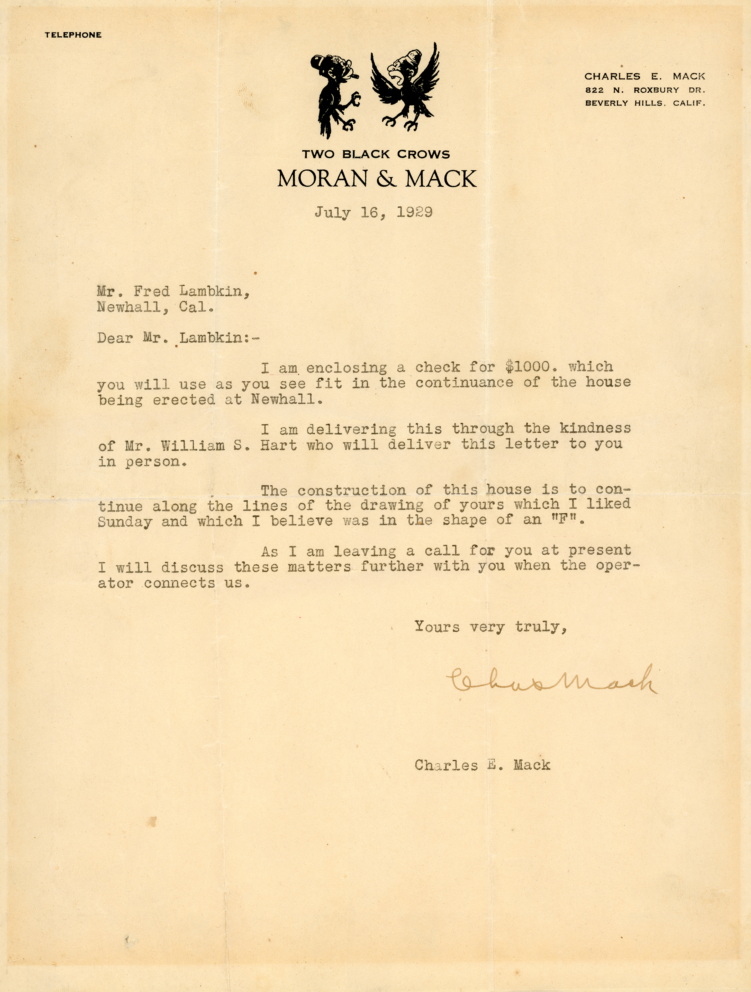 In addition to being the local Chevrolet dealer and a Newhall School Board member for a number of years, Fred Lamkin was a builder of single- and multi-family homes and commercial projects in the Newhall area. This letter from the popular blackface comedian Charles E. "Charley" Mack authorizes Lamkin (misspelled Lambkin) to proceed with construction of a house based on Lamkin's design.