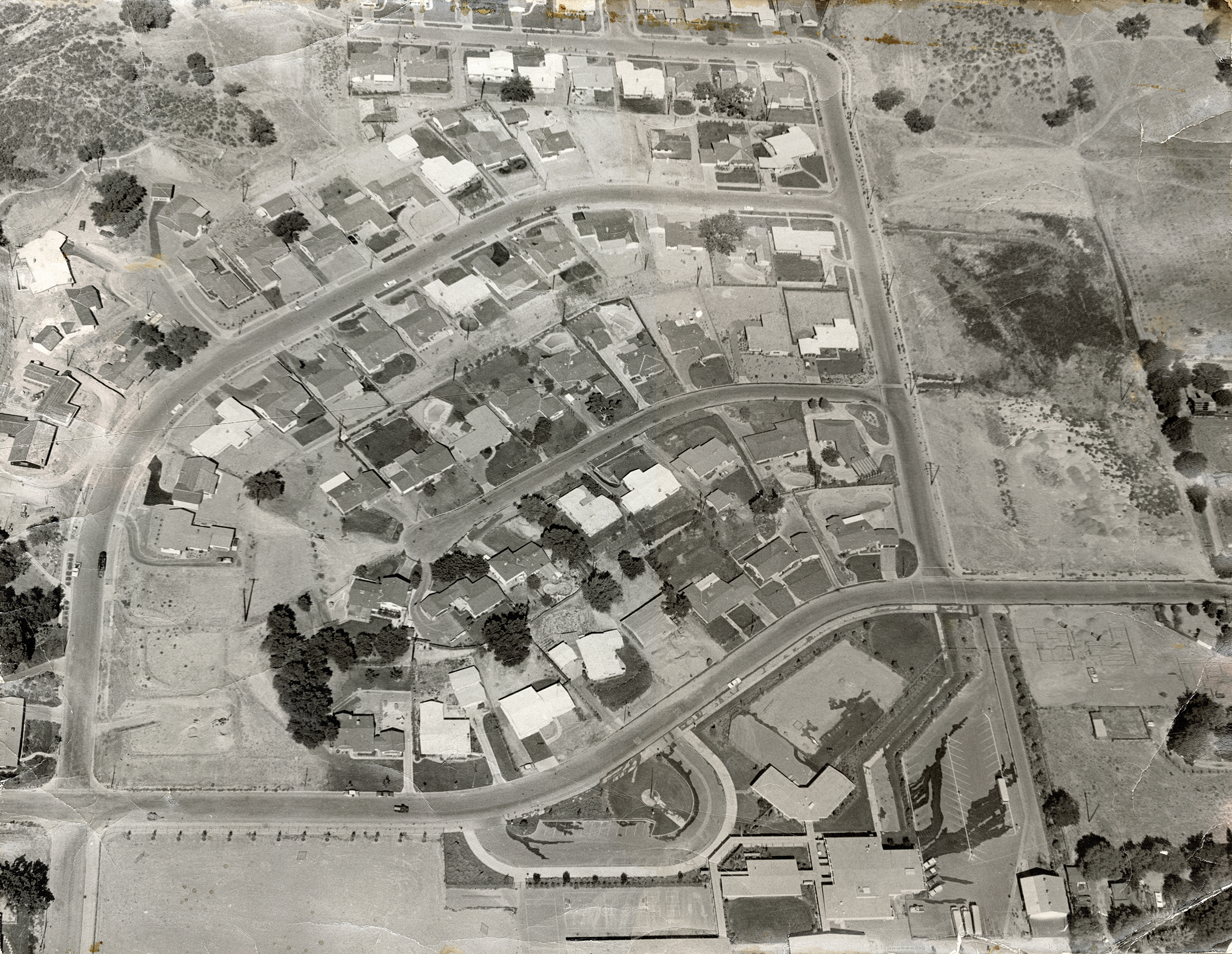 North is to the right. At the bottom (east) is Peachland Avenue and the new Peachland Avenue Elementary School, which was the second campus in the Newhall School District. Above it (to the west) are
