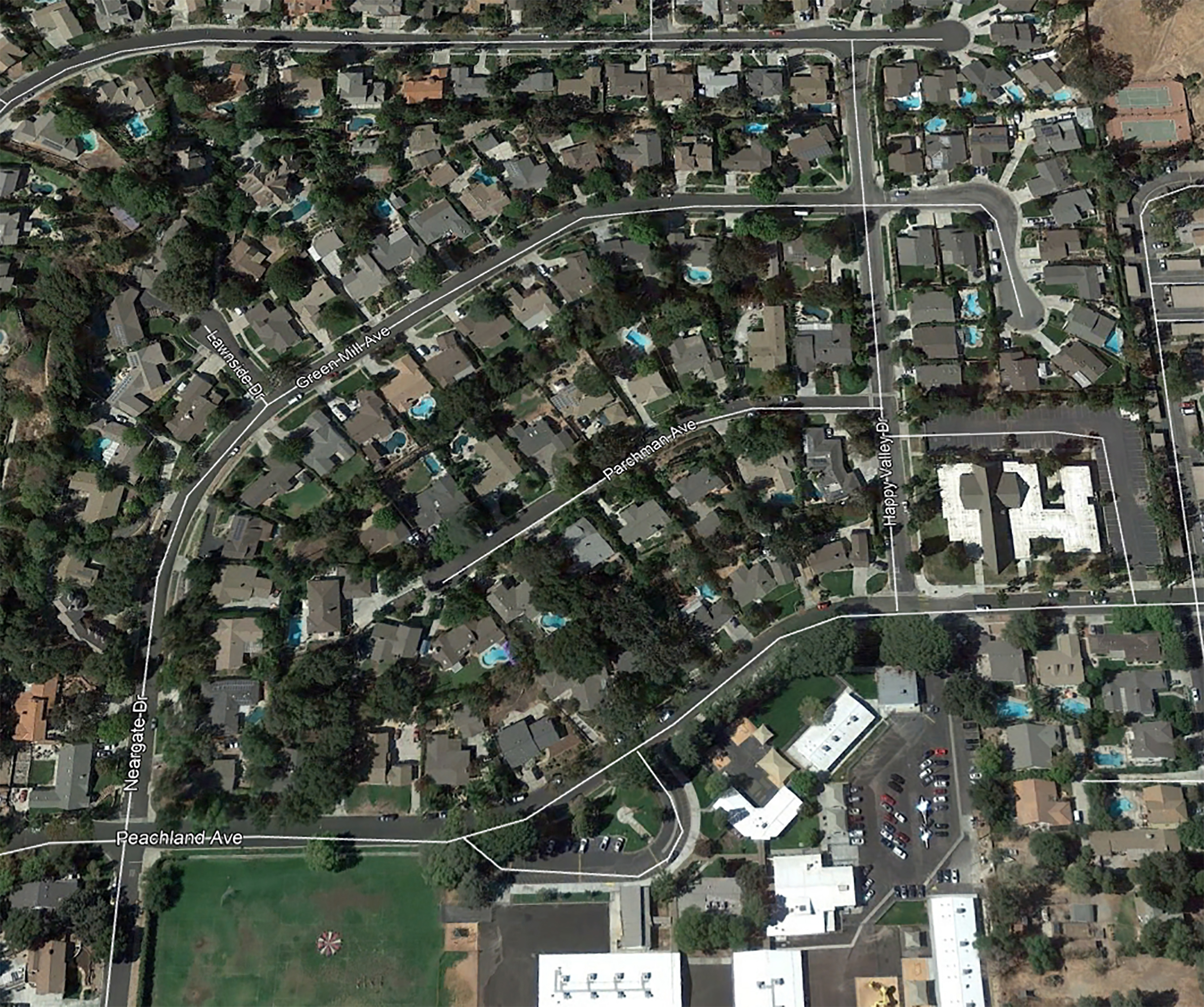 To the right of center, running top to bottom, is (east-west) Happy Valley Drive. The open lot to the right (north) of it is the future