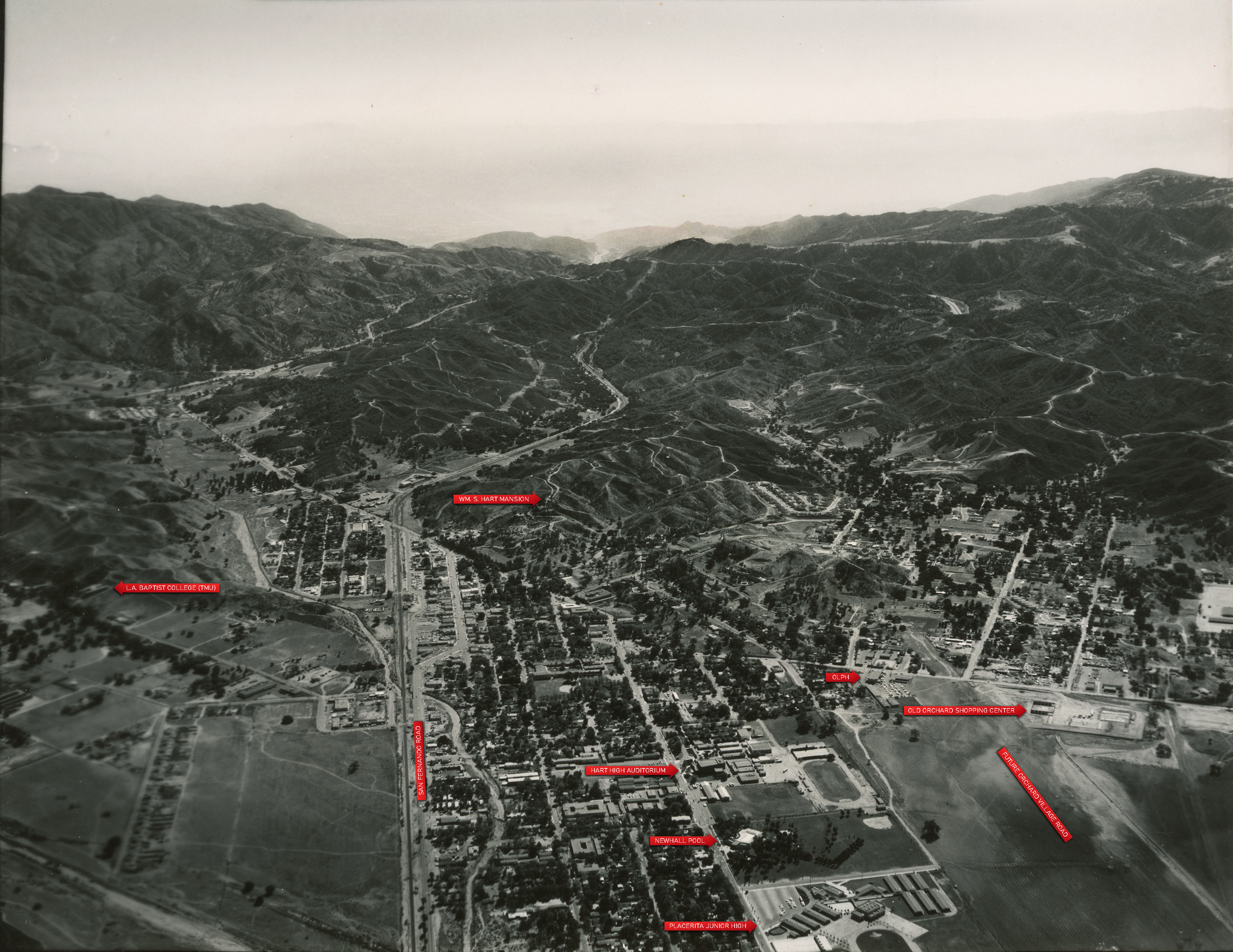 Aerial photograph of Newhall looking south in 1964. Photograph and 4x5-inch copy print made by Ted Lamkin. Dated on the back, October 31, 1964. This is one in a series of aerial photographs showing the Old Orchard Shopping Center under construction at the northwest corner of Lyons Avenue and the Valley Street extension, which became Orchard Village Road. The shopping center is visible at far right. See labeled image below.