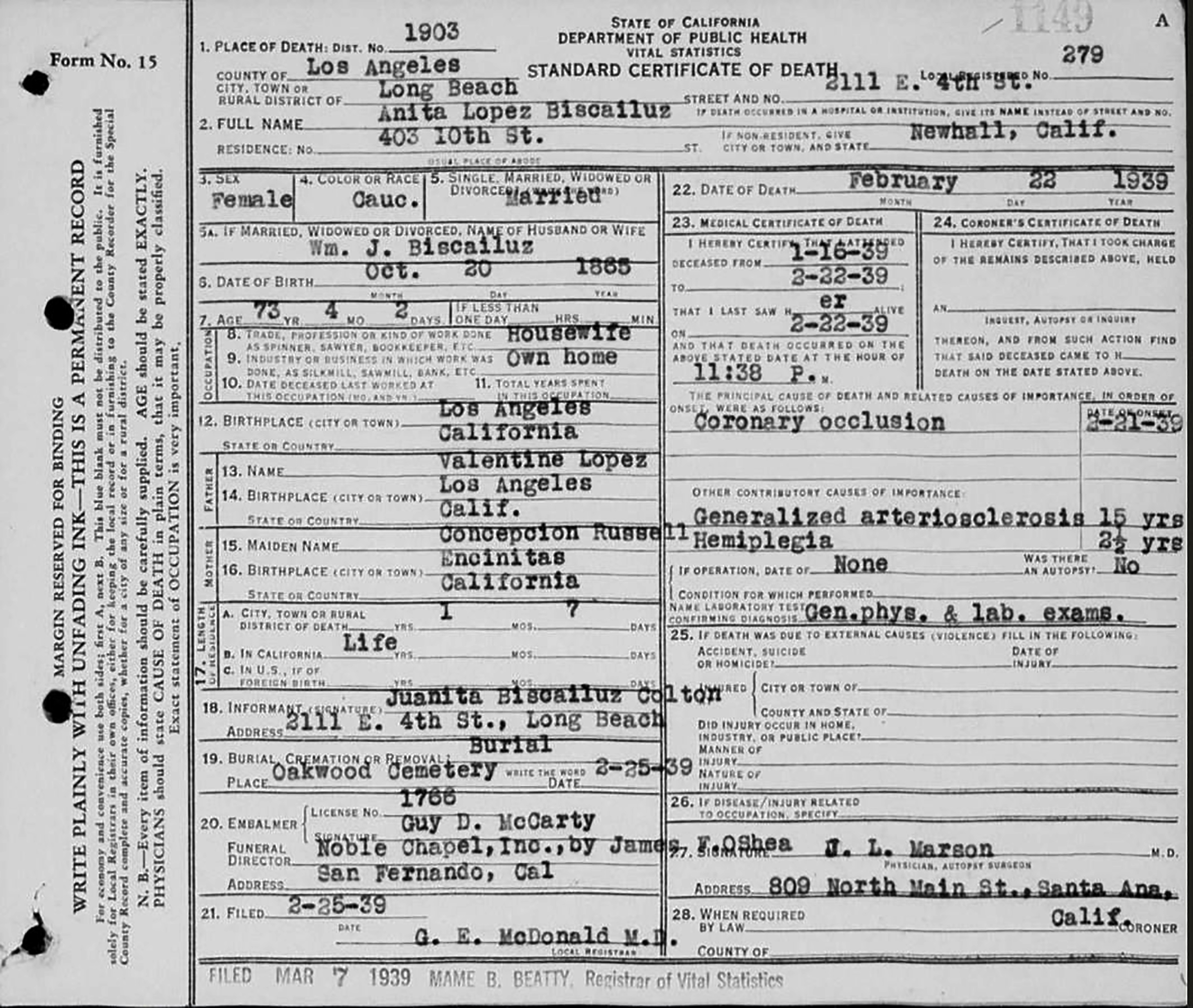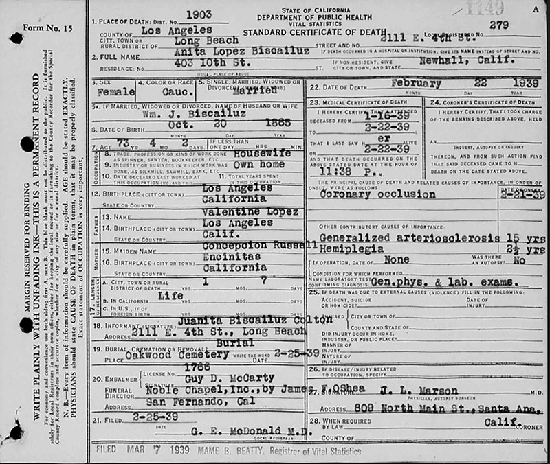 Death certificate for Anita Lopez Biscailuz.