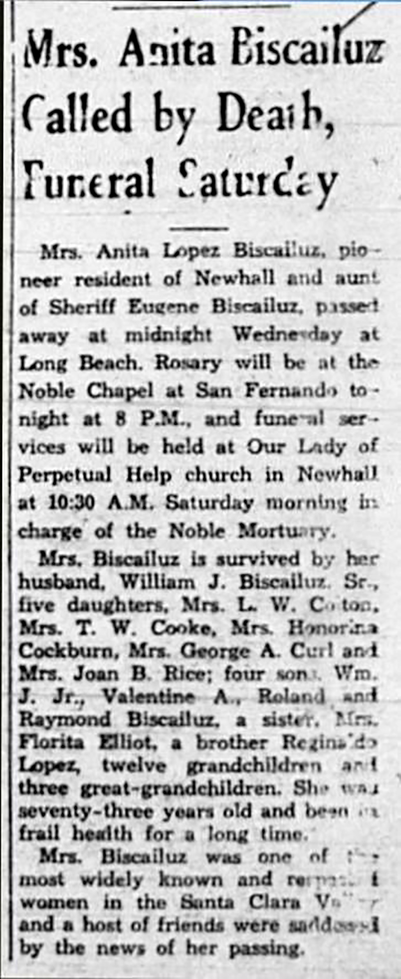 Mrs. Anita Lopez Biscailuz, pioneer resident of Newhall and aunt of Sheriff Eugene Biscailuz, passed away at midnight Wednesday at Long Beach. Rosary will be at the Noble Chapel at San Fernando tonight at 8 p.m., and funeral services will be held at Our Lady of Perpetual Help church in Newhall at 10:30 a.m. Saturday morning in charge of the Noble Mortuary.