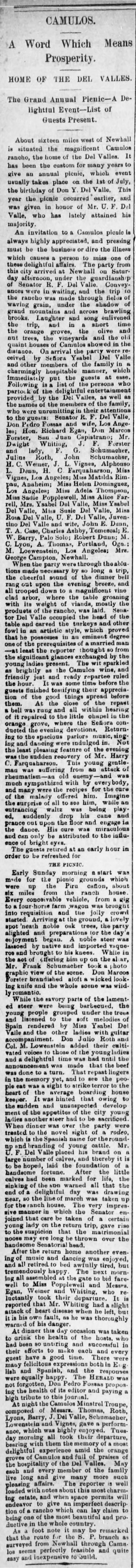 An invitation to a Camulos picnic is always highly appreciated, and pressing must be the business or dire the illness which causes a person to miss one of these delightful affairs. The party from this city arrived at Newhall on Saturday afternoon, under the guardianship of Senator R.F. Del Valle. Conveyances were in waiting, and the trip to the rancho was made through fields of waving grain, under the shadow of grand mountains and across brawling brooks. Laughter and song enlivened the trip, and in a short time the orange groves, the olive and nut trees, the vineyards and the old quaint houses of Camulos showed in the distance. On arrival the party were received by Señora Ysabel Del Valle and other members of the family in a charmingly hospitable manner, which immediately put the guests at ease. Following is a list of the persons who partook of the delightful entertainment provided by the Del Valles, as well as the names of the members of the family, who were unremitting in their attentions to the guests: Senator R.F. Del Valle, Don Pedro Fossas and wife, Los Angeles; Hon. Richard Egan, Don Marcos Forster, San Juan Capistrano; Mr. Dwight Whiting, J.F. Forster and lady, F.G. Schumacher, Julius Roth, John Schumacher, H.C. Wemer, J.L. Vignes, Alphonso L. Denn, H.C. Farquaharson, Miss Vignes, Los Angeles; Miss Matilda Rimpau, Anaheim; Miss Helen Dominguez, Los Angeles; Miss Adela Thompson, Miss Sadie Popplewell, Miss Alice Farrell, Mrs. Ysabel Del Valle, Miss Ysabel Del Valle, Mill Susie Del Valle, Miss Rosa Del Valle, U.F. Del Valle, Juventino Del Valle and wife, John K. Dunn, T.A. Case, Charles Ashby, Temescal; E.W. Barry, Palo Solo; Robert Dunn; M.C. Lyon, A. Thomas, Portland, Ogn.; M. Loewenstein, Los Angeles; Mrs. George Campton, Newhall.