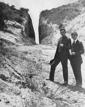 Movie men Storm Boyd (left) and Phil Lang at Beale's Cut, looking south, possibly as early as 1907, when Kalem Co. was founded, but more likely five years later. | ||
